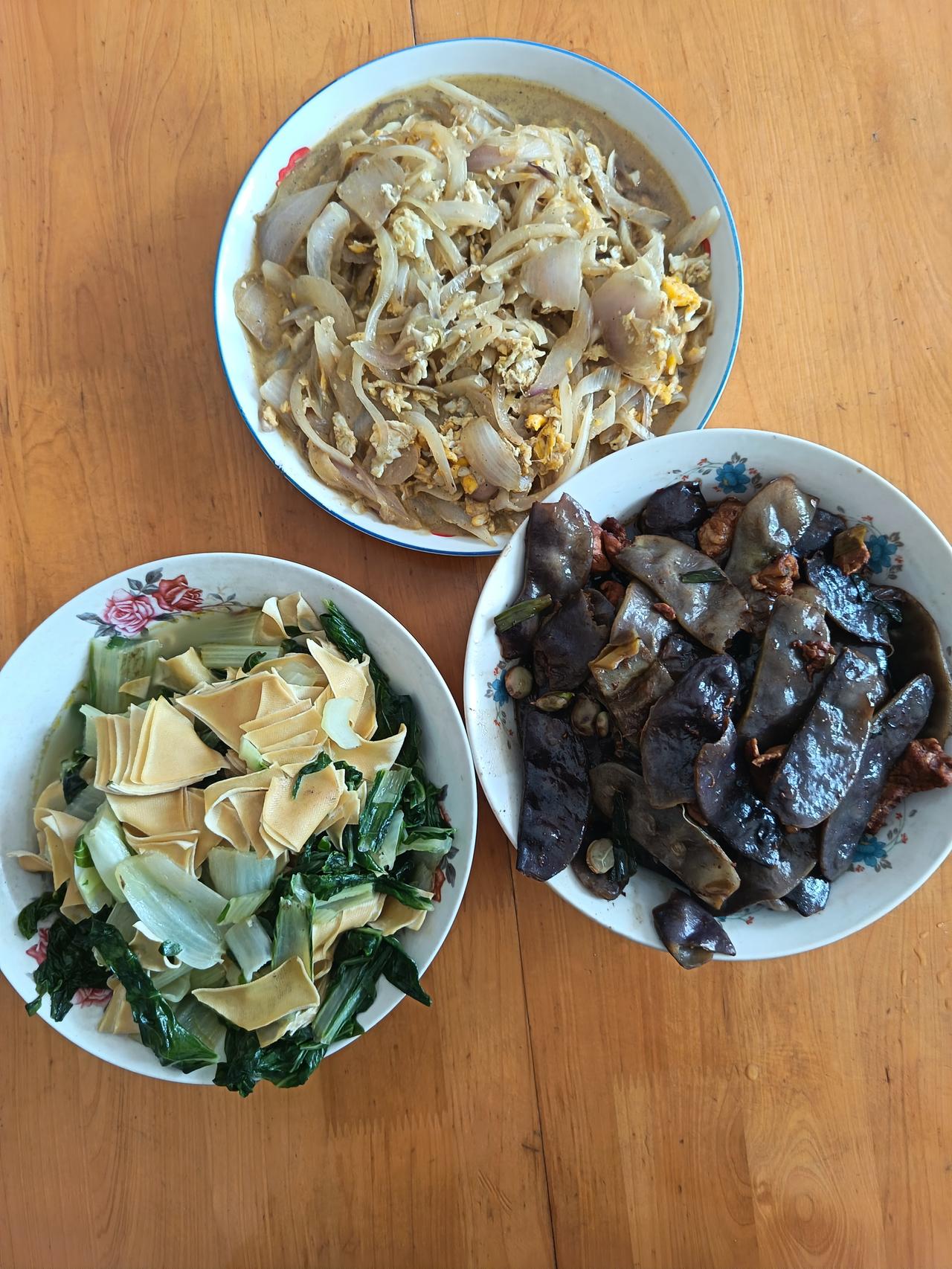 今天把扁豆藤全扯了! 尽管上面还有很多花朵,气温低,也不会结豆角了。即使结,遇到一场霜,也全蔫! 今天老伴整了三个菜:青菜烧卜页、洋葱炒鸡蛋,扁豆角烧肉。 扁豆角烧肉应该是最后一顿了,再想吃,也得等来年了。 也许大家会说,你们家的生活太清贫,天天都是家常菜,也太省了吧? 我总觉得,吃得太精致也不一定好,肠胃负担重了,反而疾病会来找。反倒是粗茶淡饭,对身体有益处! 小日子过得好不好,舒服自在就好!晒图笔记大赛 家常扁豆