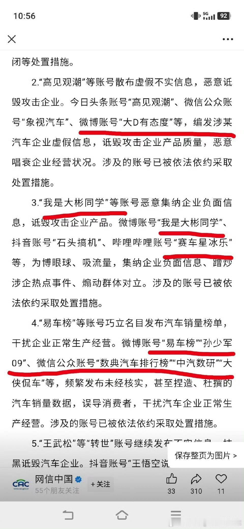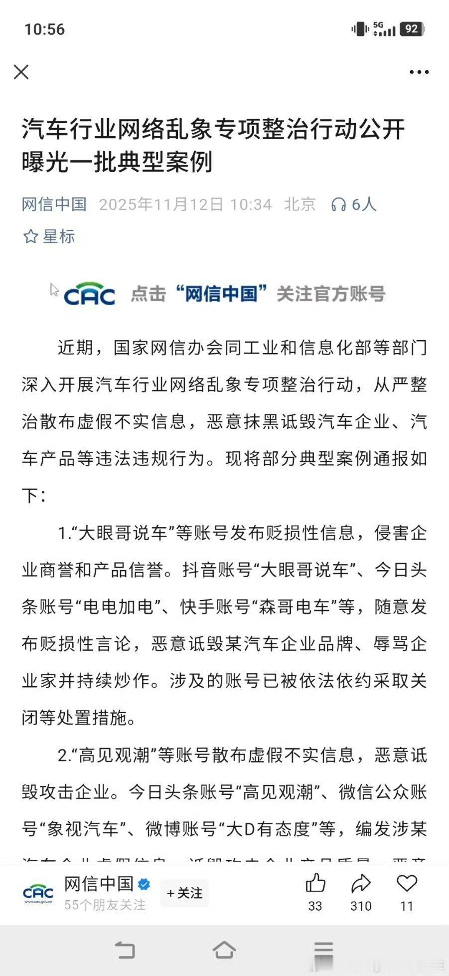 【整治汽车行业网络乱象,国家网信办公开曝光一批典型案例】11 月 12 日消息,“网信中国”公众号今日通报,近期,国家网信办会同工业和信息化部等部门深入开展汽车行业网络乱象专项整治行动,从严整治散布虚假不实信息,恶意抹黑诋毁汽车企业、汽车产品等违法违规行为。附此次通报的部分典型案例如下:“大眼哥说车”等账号发布贬损性信息,侵害企业商誉和产品信誉。抖音账号“大眼哥说车”、今日头条账号“电电加电”、快手账号“森哥电车”等,随意发布贬损性言论,恶意诋毁某汽车企业品牌、辱骂企业家并持续炒作。涉及的账号已被依法依约采取关闭等处置措施。“高见观潮”等账号散布虚假不实信息,恶意诋毁攻击企业。今日头条账号“高见观潮”、微信公众账号“象视汽车”、微博账号“大 D 有态度”等,编发涉某汽车企业虚假信息,诋毁攻击企业产品质量,恶意唱衰企业经营状况。涉及的账号已被依法依约采取处置措施。“我是大彬同学”等账号恶意集纳企业负面信息,诋毁攻击企业产品。微博账号“我是大彬同学”、抖音账号“石头搞机”、哔哩哔哩账号“赛车星冰乐”等,为博眼球、吸流量,集纳企业负面信息、蹭炒涉企热点事件、煽动群体对立。涉及的账号已被依法依约采取处置措施。“易车榜”等账号巧立名目发布汽车销量榜单,干扰企业正常生产经营。微博账号“易车榜”“孙少军 09”、微信公众账号“数典汽车排行榜”“中汽数研”“大侠侃车”等,频繁发布未经核实,甚至捏造、杜撰的汽车销量数据,误导消费者,干扰汽车企业正常生产经营。涉及的账号已被依法依约采取处置措施。“王武松”等“转世”账号继续发布不实信息,抹黑诋毁汽车企业。抖音账号“王悟空说车”“987 疯狂奶爸”因多次歪曲事实诋毁新能源汽车性能,恶意抹黑某汽车企业形象声誉被依法依约关闭。上述账号使用主体,在抖音、小红书、百度等平台注册“王武松”“疯狂斯坦森”等账号,继续发布主观测评信息,抹黑攻击某新能源汽车企业产品质量。涉及的账号已被依法依约采取关闭措施。