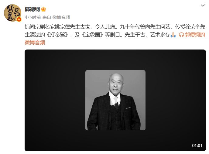 郭德纲悼念京剧名家姚宗儒:“惊闻京剧名家姚宗儒先生去世,令人悲痛。九十年代曾向先生问艺,传授徐荣奎先生演法的《打銮驾》,及《宝象国》等剧目。先生千古,艺术永存”