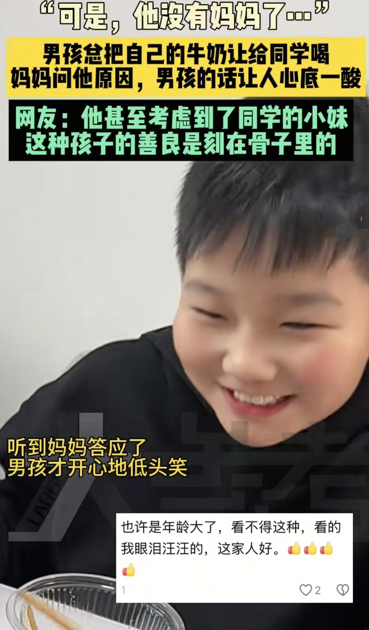 河南一男孩每天带一瓶牛奶上学,自己不喝却偷偷塞给同学。妈妈发现后很生气:“你不要再给别人喝了。”谁知男孩接下来说的话让妈妈哽咽了,红着眼眶答应了儿子请求。 为了给男孩补充营养,妈妈让他每天带一瓶牛奶上学。 每天早上,男孩把牛奶往书包一揣,大声说:“妈,我走了。”然后乐呵呵的去上学。 最近一段时间,妈妈发现男孩有些不对劲,他放学总是跟一个同学走得很近,还时不时的往他手里塞东西。 妈妈本想问问啥情况,但是男孩支支吾吾的说:“没啥,没啥事,你别问了。” 为了弄清楚到底发生了什么,妈妈在学校门口蹲守了好几天,原来是男孩把自己的牛奶偷偷塞到同学手里。 那天,妈妈又看到男孩把牛奶给了同学,她有些生气的说:“牛奶你不要再给别人喝了,人家妈妈会给他买的。” 男孩往嘴里扒拉了一口咸菜,淡淡的说了句:“他没有妈妈。” 听到这话,妈妈明显愣住了,忽然从心底涌上来一股心酸,哽咽着说:“好好,那以后你带两瓶,你俩一块喝。” 男孩用恳求的语气说:“能不能带三瓶,他还有一个妹妹,他都不舍得喝,每天都带回家给妹妹喝。” 听到这里,妈妈更心酸了,非常心疼对面的两个孩子,红着眼眶说:“中中中......” 此事引发很多网友讨论,有的说,听到那句“他没有妈妈”我一个大男人眼泪都控制不住啊。 有的说孩子成绩都是次要的,只要心地善良,在我心里就是满分。 还有的开玩笑说,能不能带四瓶,我也想喝...... 不少人朝男孩竖起大拇指:好孩子,做的真棒! 与此同时,还要为这位母亲鼓掌,她没有打扰孩子们之间的友谊,而是包容和支持,给孩子树立一个好的榜样,真是有爱的一家人!