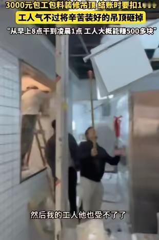 “欺负老实人,这次栽了!”湖北武汉,一场看似普通的装修风波,却揭示了人性深处的那些微妙角落。陈老板为了赶在开业前把新店装修完毕,毫不犹豫地找了三位工人包工包料,谈好价格是3000块钱。起初,大家都信誓旦旦,心想着只要努力干完,赚点辛苦钱也算值了。 然而,事情的发展远比预想的复杂。工人们从早上8点一直干到凌晨1点,汗水湿透了衣背,脸上满是疲惫,但他们心里都知道,这是为了一个共同的目标:顺利开业。可是,结账时,陈老板却像变了个人,开始挑剔吊顶的每一处细节,最后竟然扣掉了整整1000块钱!工人们满腔委屈,忍不住爆发了。 愤怒的他们,决定用最激烈的方式表达不满——砸了已经装好的吊顶。那一瞬间,原本希望用行动换来一份尊重的努力变成了破坏的行为。陈老板的损失也随之而来,不仅是装修的重新修复,更是信任的崩塌。 这场“冲突”看似简单,却折射出社会中许多更深层次的问题。我们常常在“诚信”与“利益”之间摇摆。陈老板的行为,或许代表了一部分人的“斤斤计较”,也反映出“信任”在现实中变得多么脆弱。而工人们的愤怒,也提醒我们:在合作中,尊重和理解才是最重要的纽带。 更令人深思的是,这场闹剧的背后隐藏着一个普遍的社会现象——“老实人”的价值被低估。工人们辛苦付出,却因为一句话、一点利益的差异,瞬间失去了耐心。而陈老板的“挑剔”与“扣钱”,又是否反映出他自己内心的焦虑和不安?在这个追求效率和利润的时代,人与人之间的信任变得尤为珍贵。 或许,我们都应该反思:在合作与信任的关系中,最重要的不是“多付钱”或者“多收钱”,而是彼此的尊重和理解。毕竟,社会的温度,来自每一个愿意相信别人、被人信任的人。这个事件告诉我们:欺负老实人,可能一时得逞,但长远来看,只会让自己失去更多。只有用善意和诚信去经营关系,才能真正赢得持久的尊重和合作。 最后,希望每个人都能从中汲取一份教训:在这个充满变数的社会,善良不是软弱,而是一种力量。相信人、尊重人,才能让我们的社会变得更温暖、更有希望。