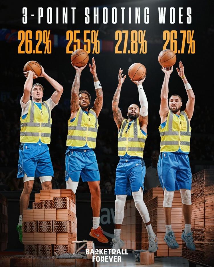 独行侠球员赛季至今三分命中率: 1、克里斯蒂:45.3% 2、哈迪:36% 3、拉塞尔:27.8% 4、浓眉:27.3% 5、克莱:26.7% 6、弗拉格:26.2% 7、华盛顿:25.5% 8、马绍尔:21.4% 全队仅有克里斯蒂和马绍尔两人的三分球命中率超过30%,且只有克里斯蒂场均命中超过2个。可以说,如今独行侠在三分线外,最靠谱的选择就是克里斯蒂,尤其是落在底角的克里斯蒂,准度相当离谱。 而其他人,沉迷于三分出手,克莱、拉塞尔、华盛顿的场均三分出手,都超过了6次,但和他们的命中率结合在一起,就有点糟糕了。 尤其是克莱,三分球场均6投1.6中,命中率26.7%,在此前,他的生涯最低命中率是38.5%,直接来了个断崖式下滑。 就这帮人的状态,炒掉nico似乎也没法扭转颓势...
