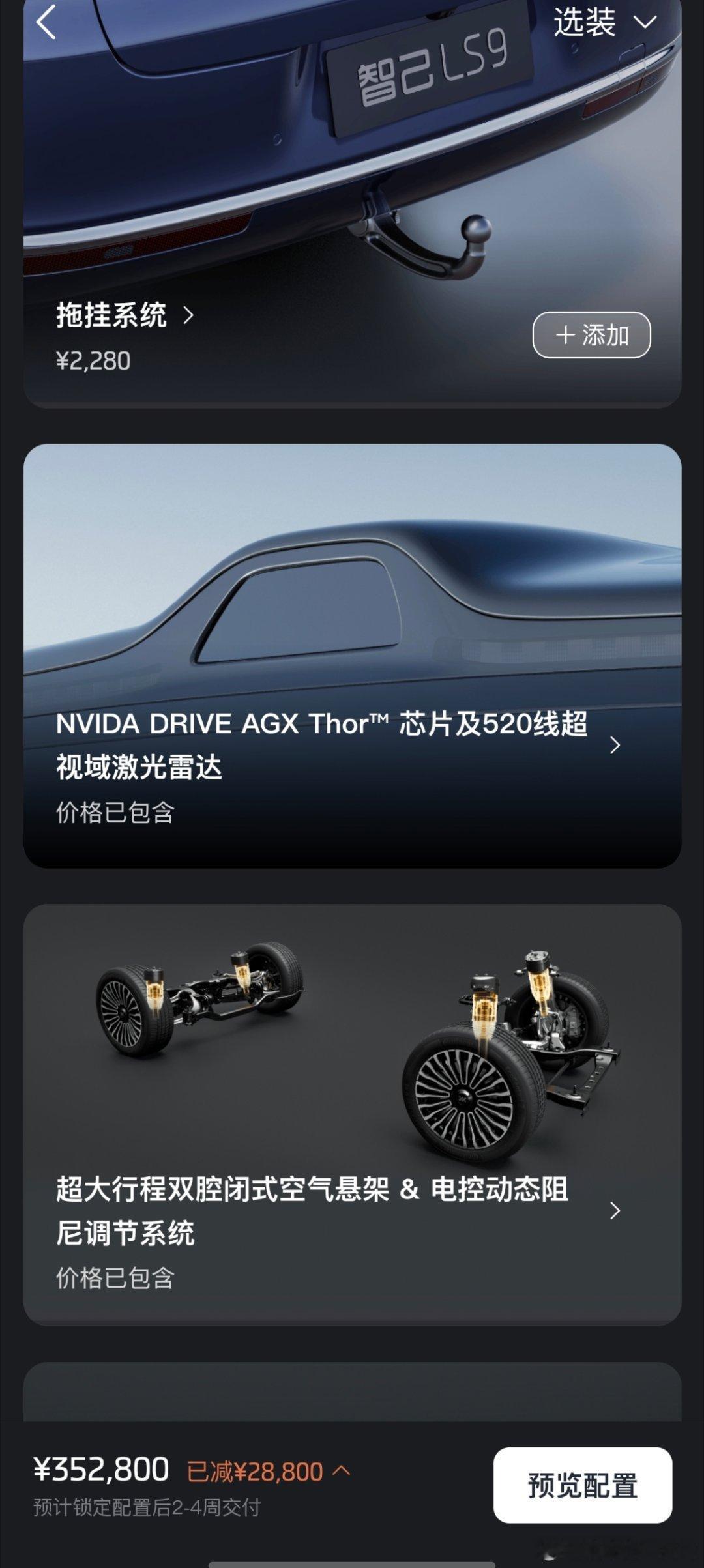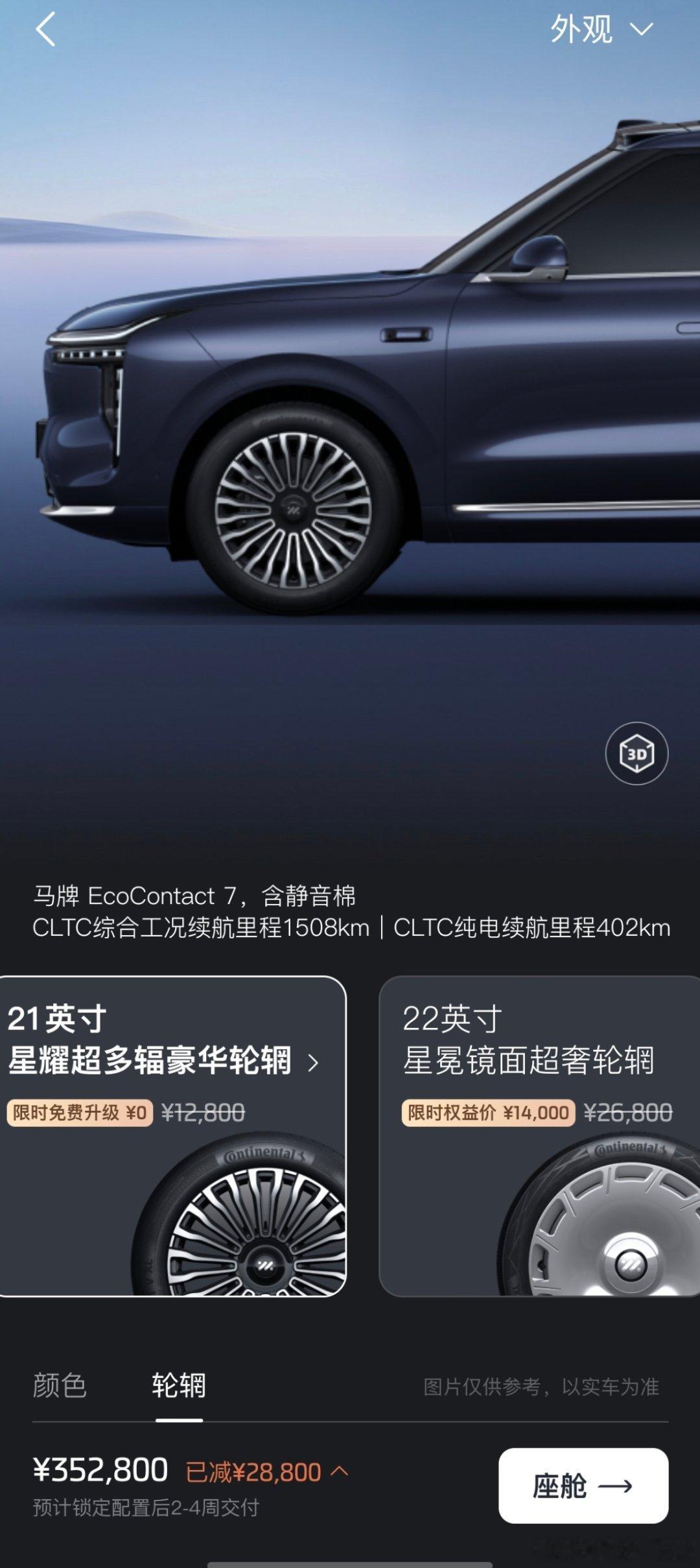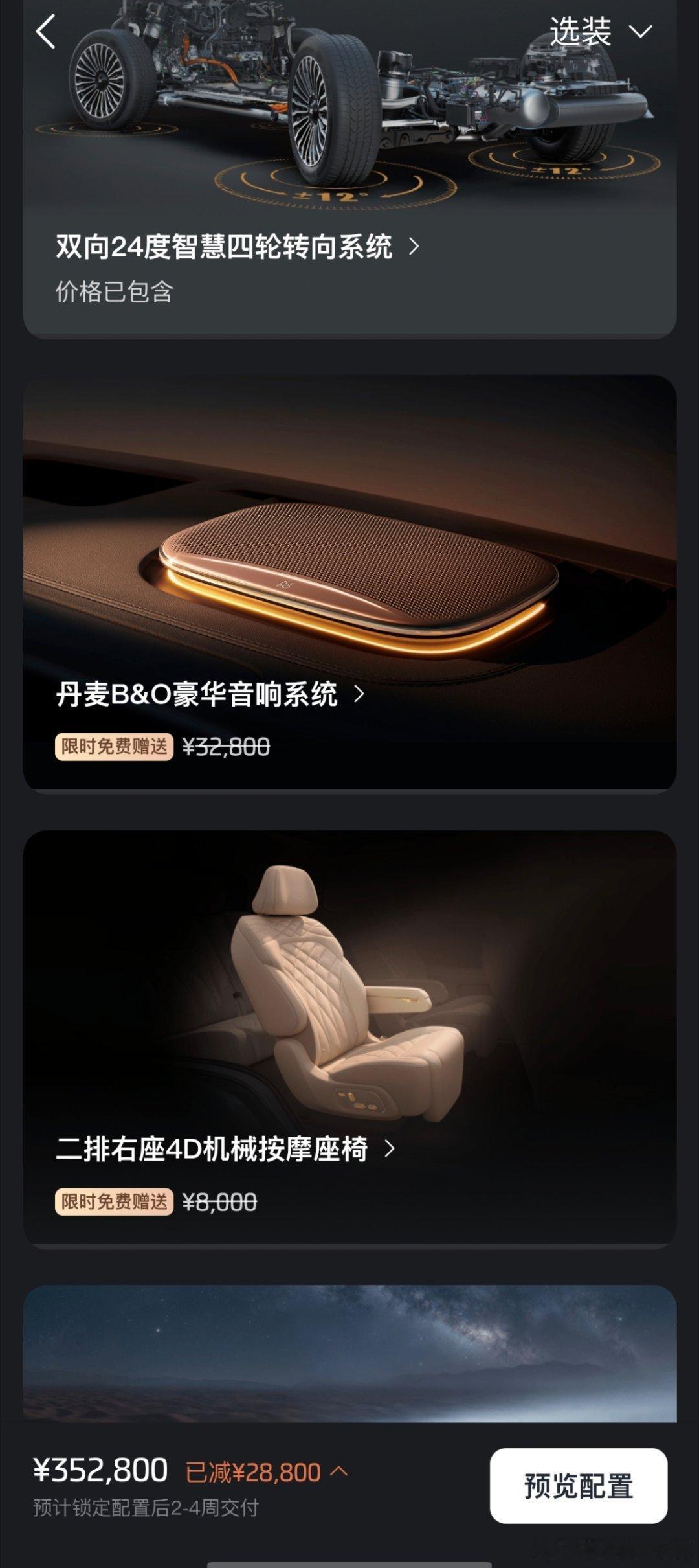 我又上屏了。智己这回彻底站(卷)起来了。智己LS9上市发布:52kWh:32.28万元起66kWh:35.28万元起配置如名,只选电池。目前唯一一定要加钱的是22英寸的亮面大饼轮毂,限时1.4万元。如果不想花钱,21英寸的多幅轮圈限时免费。信我,这1.4万,值。大饼轮毂再配上乔戈里银,那个“邪恶感”,可以的。ps:方向盘,一定要半幅!其他的配置,虽然标配(限时),还是要盘一盘。(主要是一些友商还要选装的配置)后轮随动转向(24°)、电动踏板、冷暖箱、后排娱乐屏、副驾屏、机械按摩座椅、B&O音响、双腔空悬、HUD……