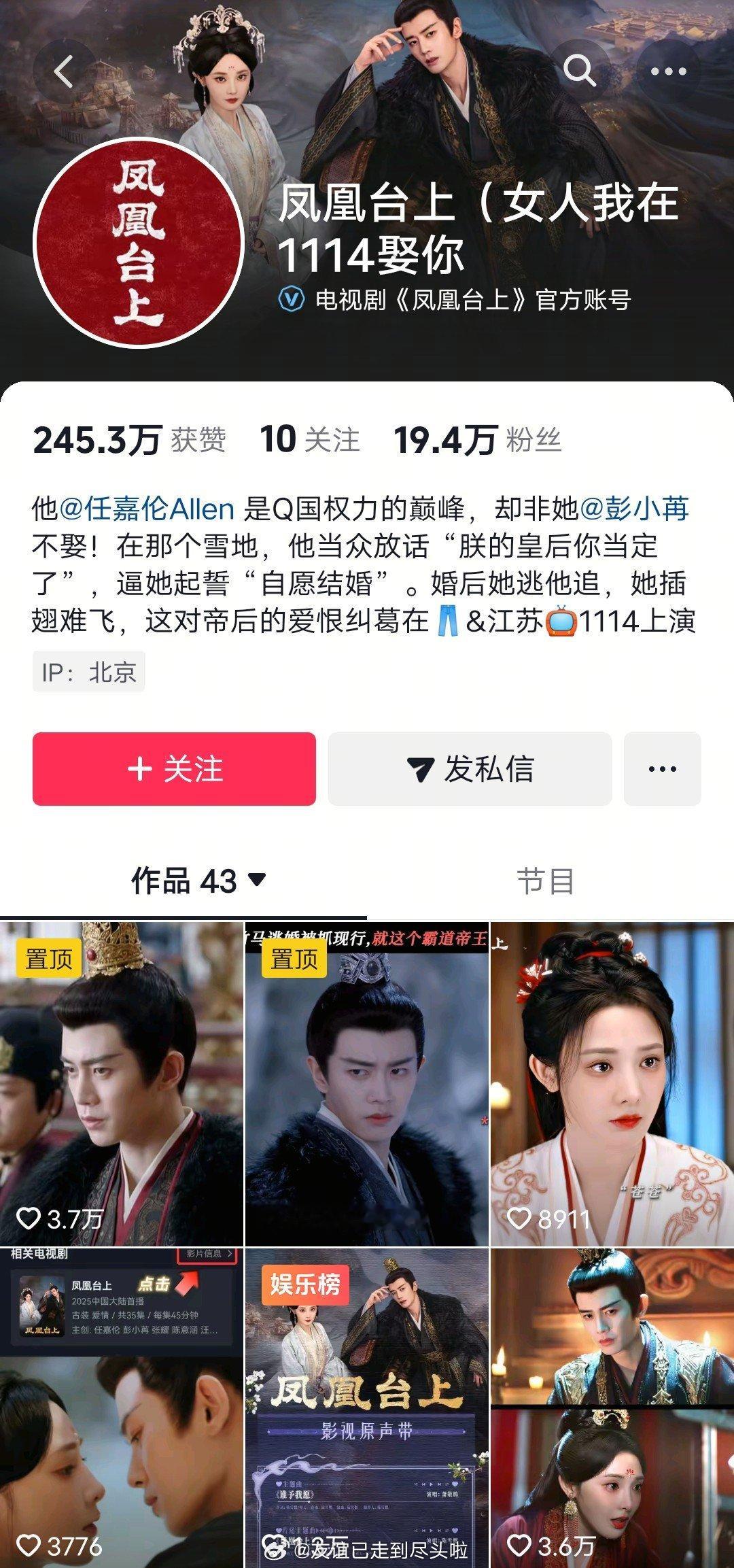 《凤凰台上》官抖把置顶视频的封面从任嘉伦改成了彭小苒,原本三个视频封面都是任嘉伦。还没开播就想着端水,想让女主上桌,有点心急了吧。