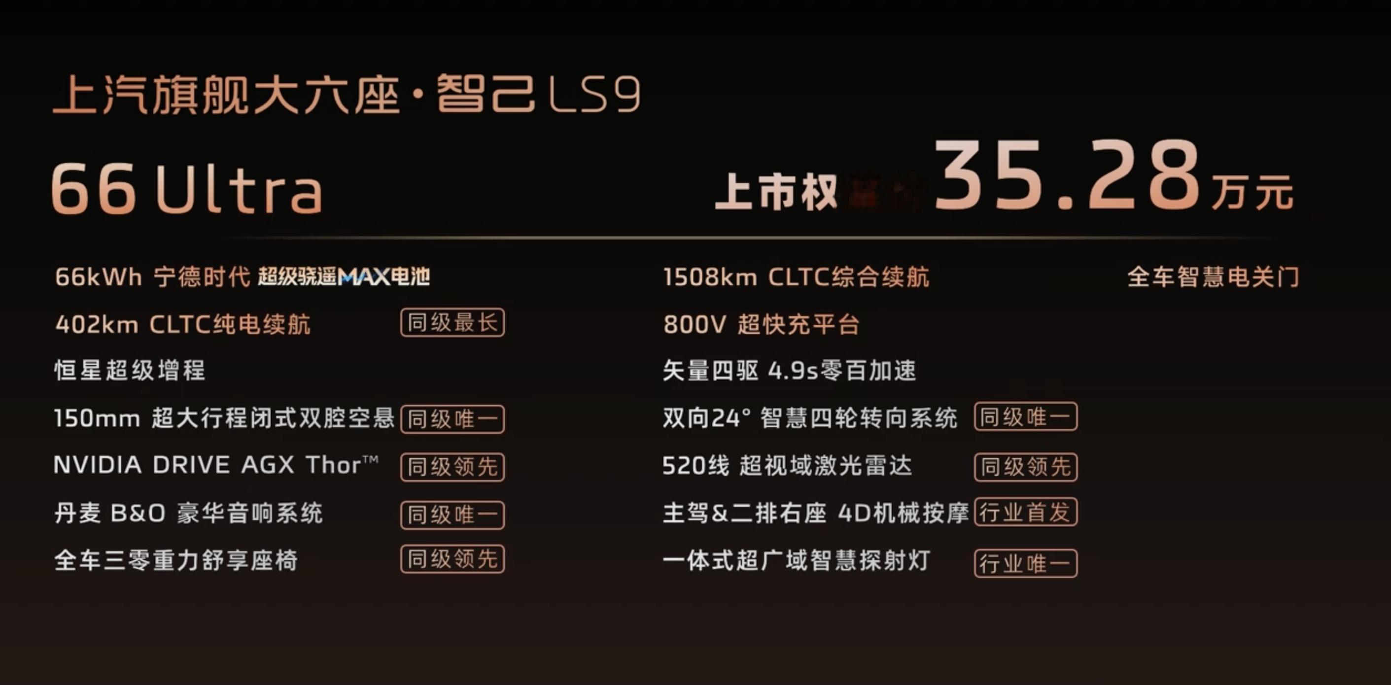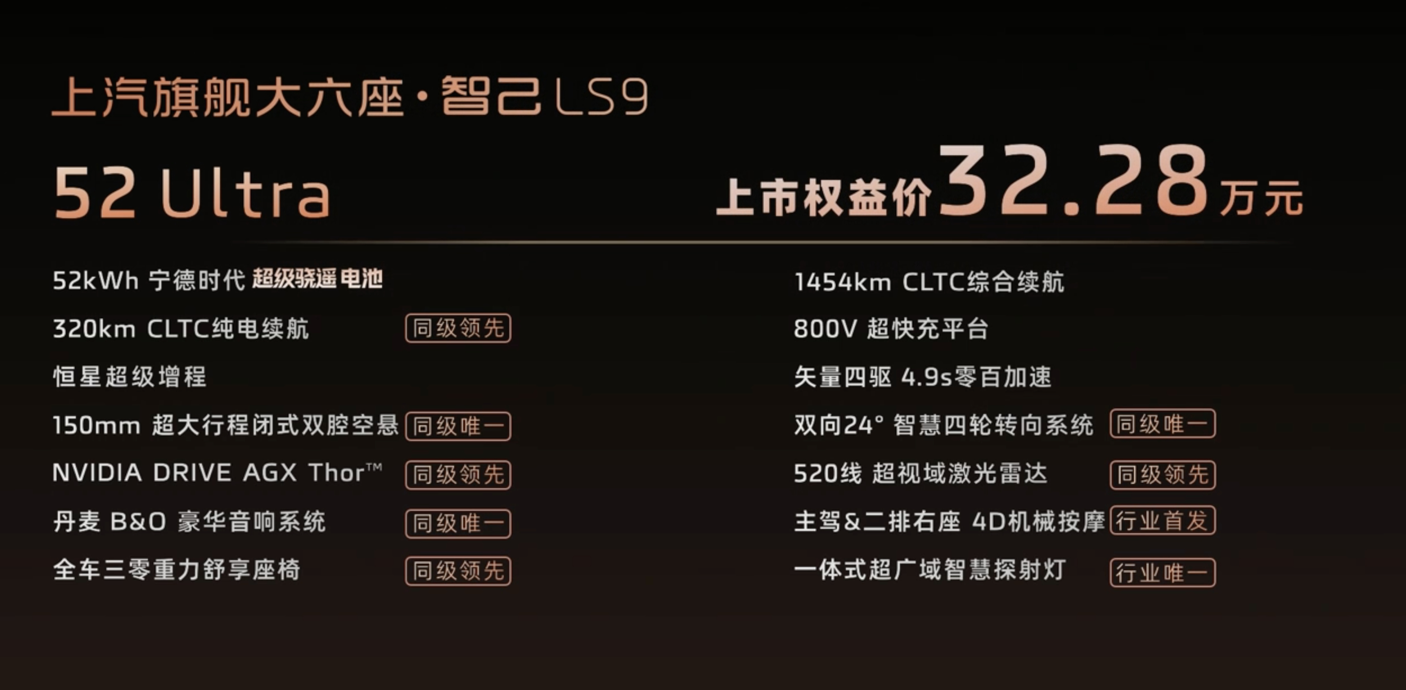 智己LS9已经正式发布,给大伙简单划一下重点~续航方面,电池有52度和66度两个版本、最大纯电续航402公里、综合续航1508公里,百公里油耗2.81L。动力方面,全系标配800伏双电机矢量四驱系统、4秒级零秒加速。驾控方面,灵蜥数字底盘3.0、灵蜥矢量四驱系统。智能方面,标配520线超视域激光雷达、英伟达芯片。内饰方面,主驾位4D机械按摩座椅、27.1英寸5K主控屏、15.6英寸3K副驾娱乐屏。新车售价32.28万元起,你心动了吗?