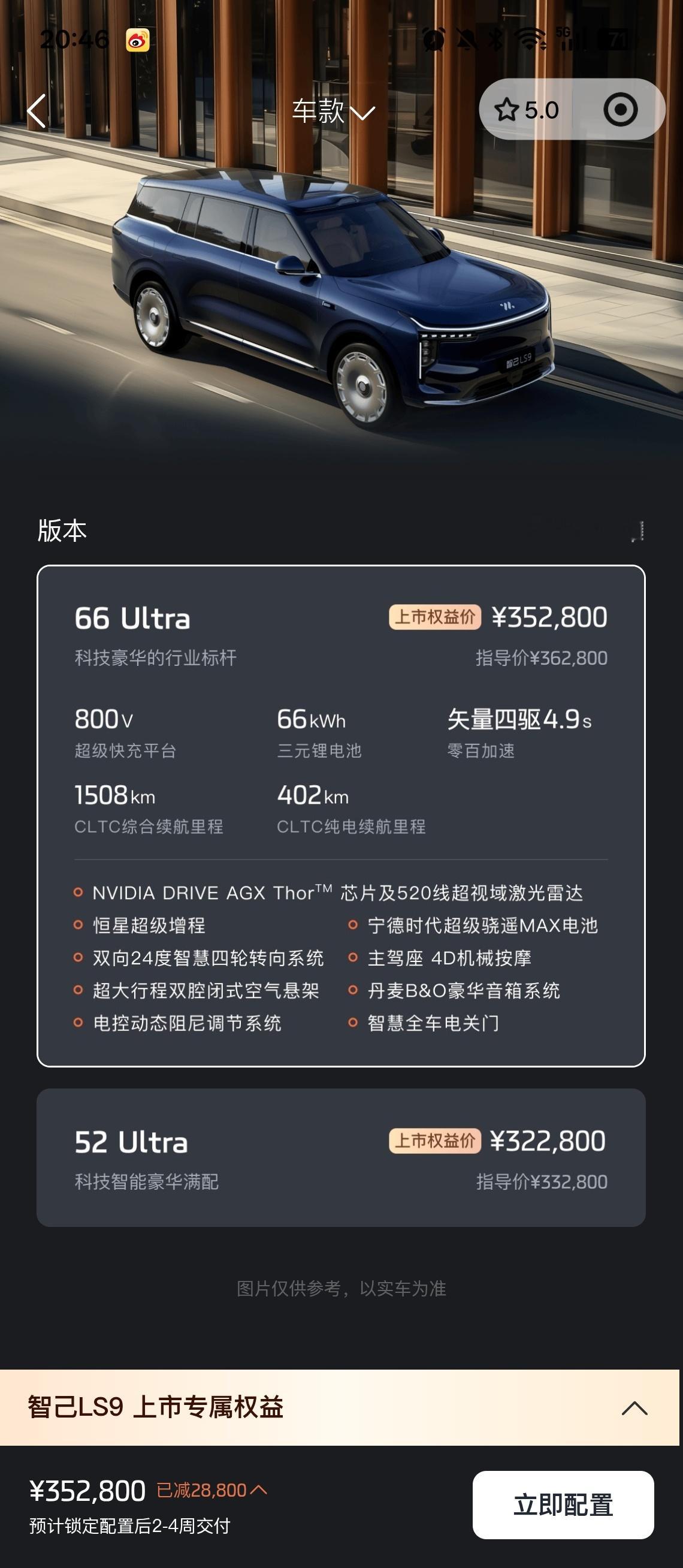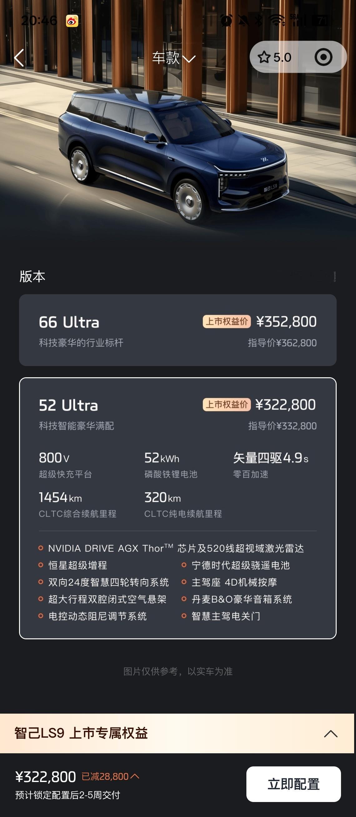 加班晚了,错过智己 LS9 的发布会…32.28w 和 35.28w 的价格在预期之内两个版本配置差别很小。一个是 66° 三元锂、一个是 52° 磷酸铁锂,另外还有电动门的差异。首发权益也不错,颜色免费、21 寸轮毂也免费,冰箱彩电大沙发一应俱全,只是除了大饼轮和拖车钩都送了。上市 25 分钟大定 5000 台,很不错啊