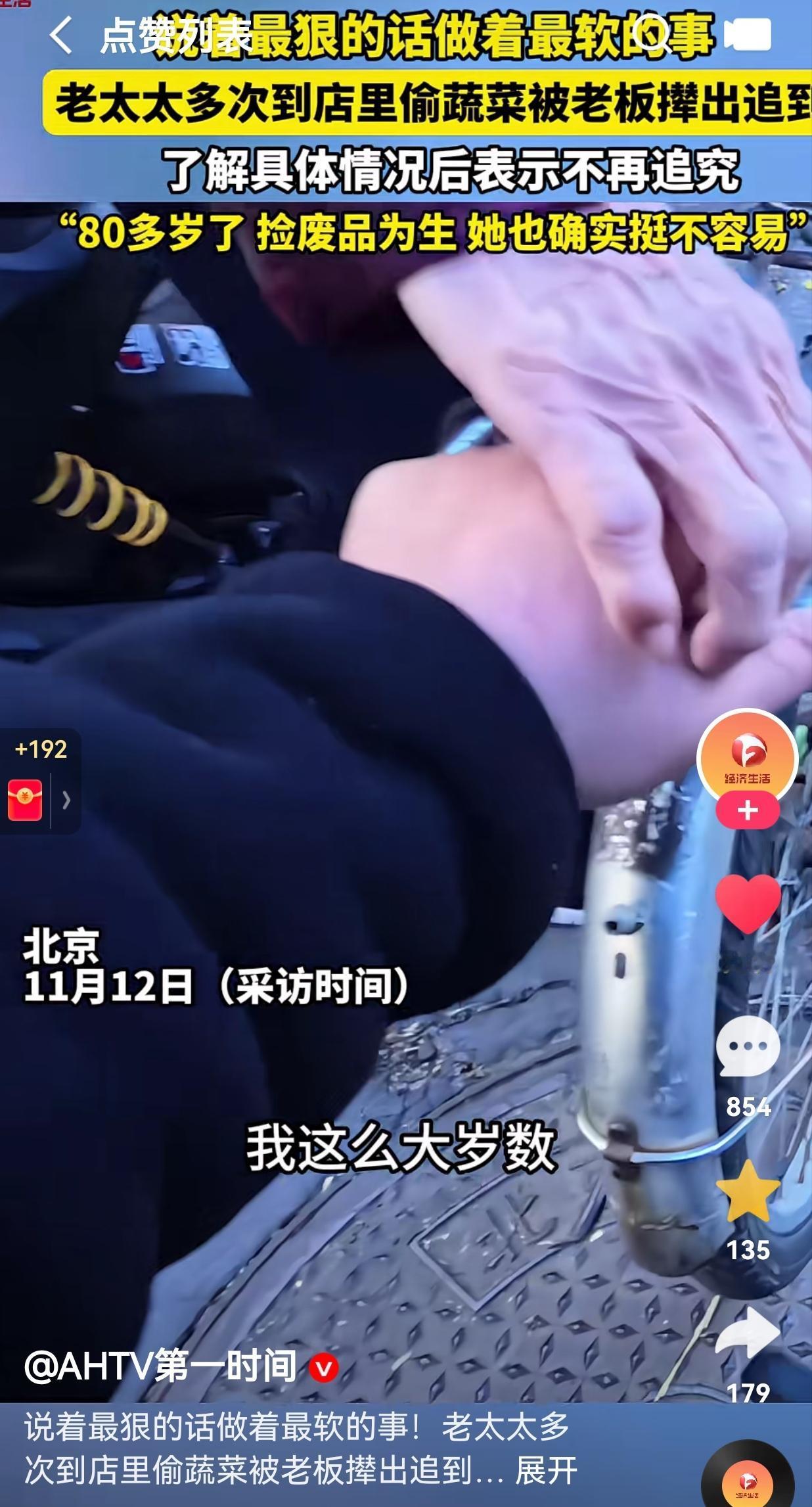 这老板讲究!北京,一老人到店里偷蔬菜,一开始老板也看到了老人偷蔬菜,没有当回事,就权当做慈善了! 谁知道老人太目中无人了,一而再再而三地偷蔬菜,昨天才偷的蔬菜,今天又开始重操旧业。老板忍不了了,尽管老人已经骑自行车离开了。 老板还是不愿意放过老人,一直跟在后边,让老人赔偿自己的损失。 你还别说,老人骑的还挺快呢?可是,还是被老板成功逮到了。 老人看自己被揪住了,赶紧出言向老板道歉。 老板却不愿意原谅老人,还对老人说:“我们做生意也不容易,不管你多大年纪,偷东西就得逮你,就算你200岁也不行。”看这架势,老人不赔偿,这件事情就算没玩。 结果,当老板得知老人的窘迫状况之后,老板心软了,也不打算追究老人的责任了,当然也不要老人的赔偿了。 据了解,老人今年80多岁了,以捡废品为生,看到老人这个样子真的于心不忍了! 网友看到后评论说,人家岁数大了,又没有什么劳动力,也是为了生活迫不得已的,都理解一下吧! 还有的网友说,贼就是贼,没有任何理由可讲。如果你们同情的话,可以带回家养着。 要我说,如果你没有钱买菜,可以问蔬菜老板要一点卖不掉的蔬菜。因为,蔬菜的消耗很快,很多隔夜的菜,就不好卖出去了。 我相信,如果你向老板说明你的难处,老板肯定会给你一些不太新鲜,但是可以吃的蔬菜。然而,就算你没有钱也不能选择偷盗呀!这是做人最基本的原则,一个人可以穷,但是,不能没有道德。更不能选择偷盗。 你年龄大了,固然可怜,人家也理解你的难处,你也要理解别人呀!不要因为你的年龄大,就肆意妄为吧! 大家觉得呢?欢迎大家评论区讨论留言。