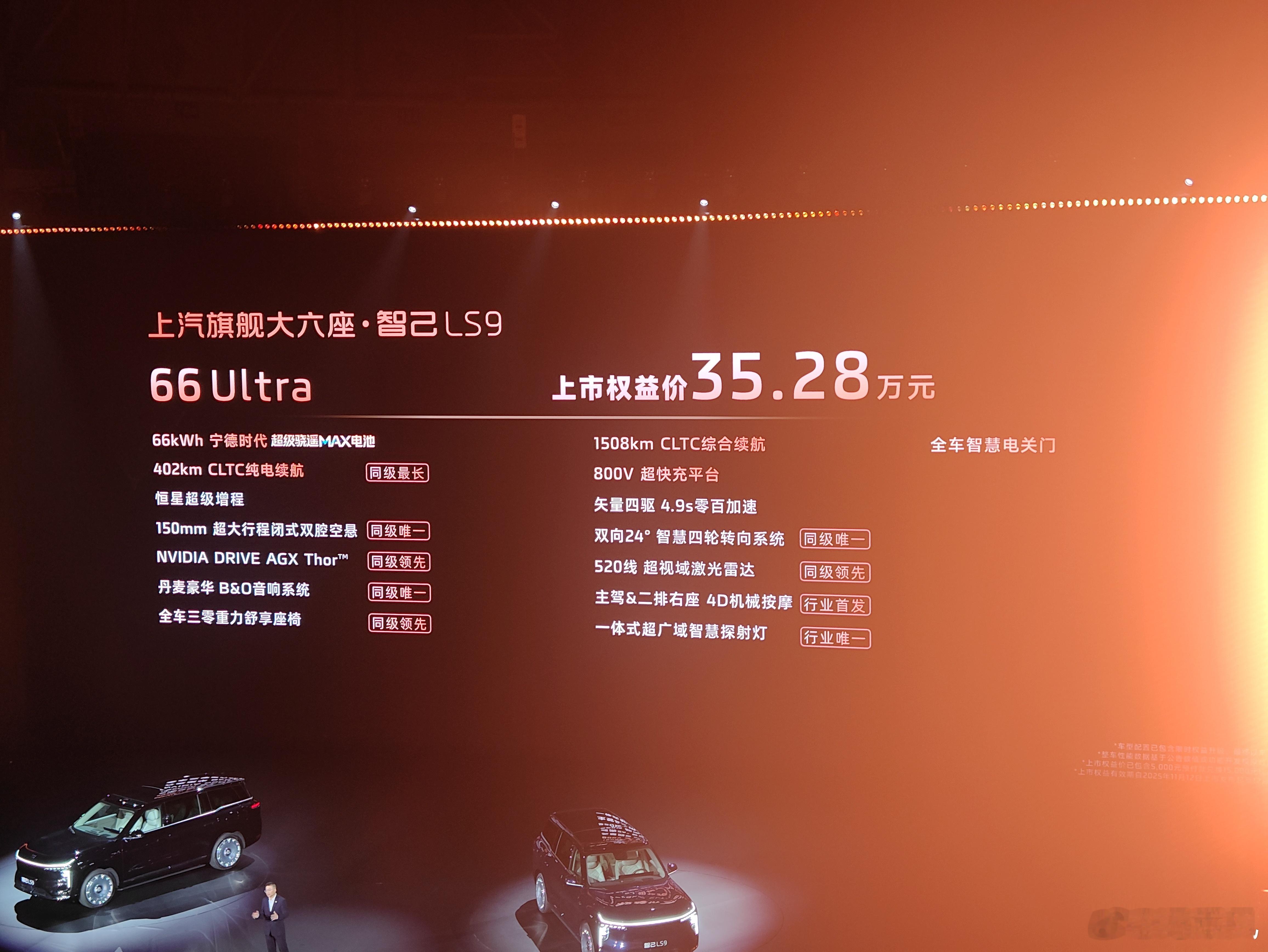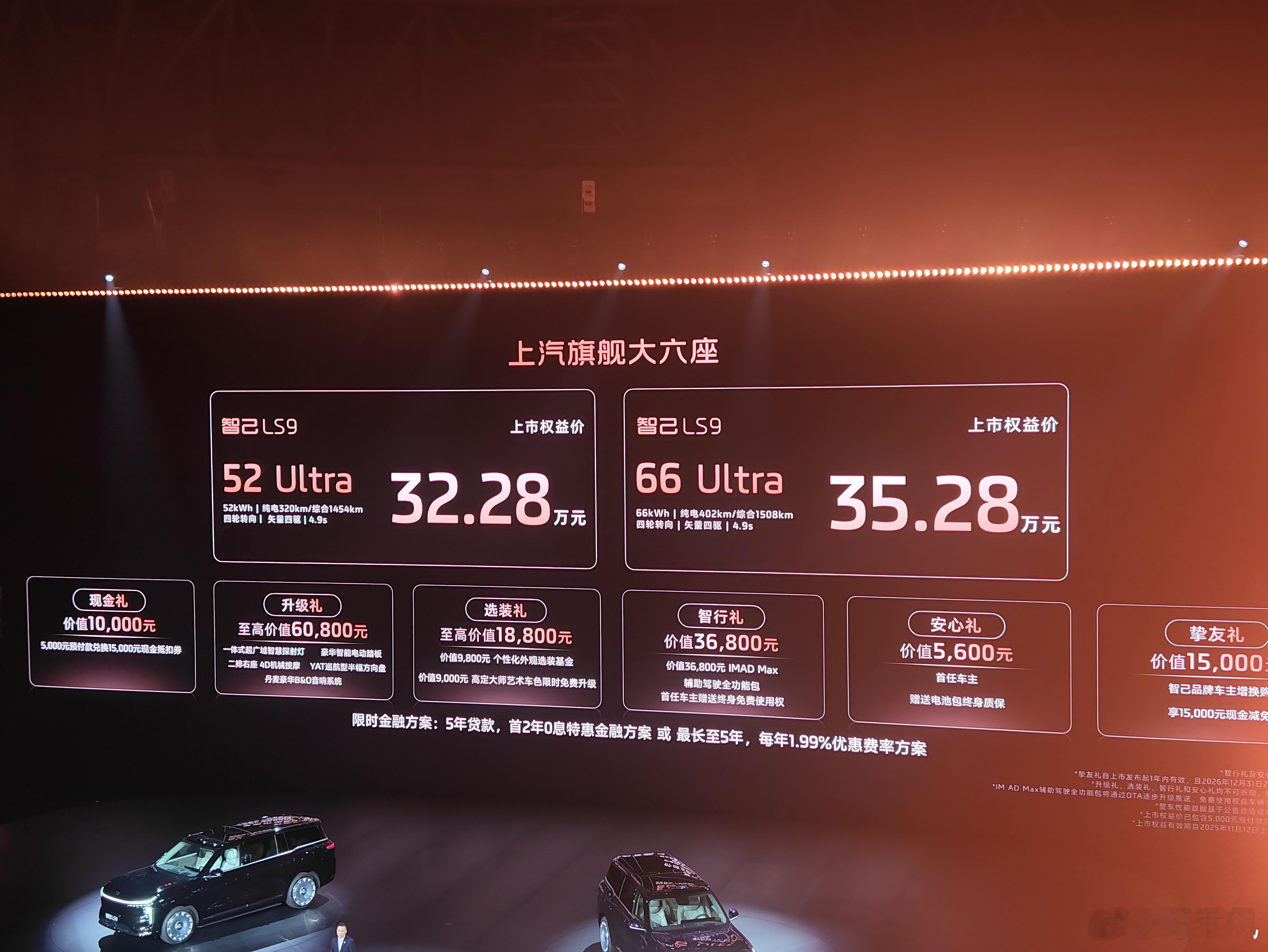 32.28万起,上汽旗舰智己LS9正式上市!上汽旗舰,一定是豪华旗舰,全系皆 Ultra, 入门即巅峰,比小型车更灵活,比五座车更好开,驾控、性能、智能、豪华,每一面皆旗舰!智己LS9提供宁德时代52度和66度两种电池选择,上市权益价32.28万到35.28万元!这车真的可以,堪称目前最强9系!(音响巨牛逼)