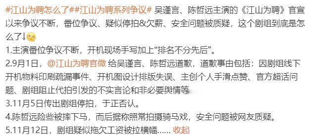 网友梳理了《江山为聘》的系列争议——番位争议、疑似停拍&欠薪、安全问题被质疑.......这个剧组到底咋了?
