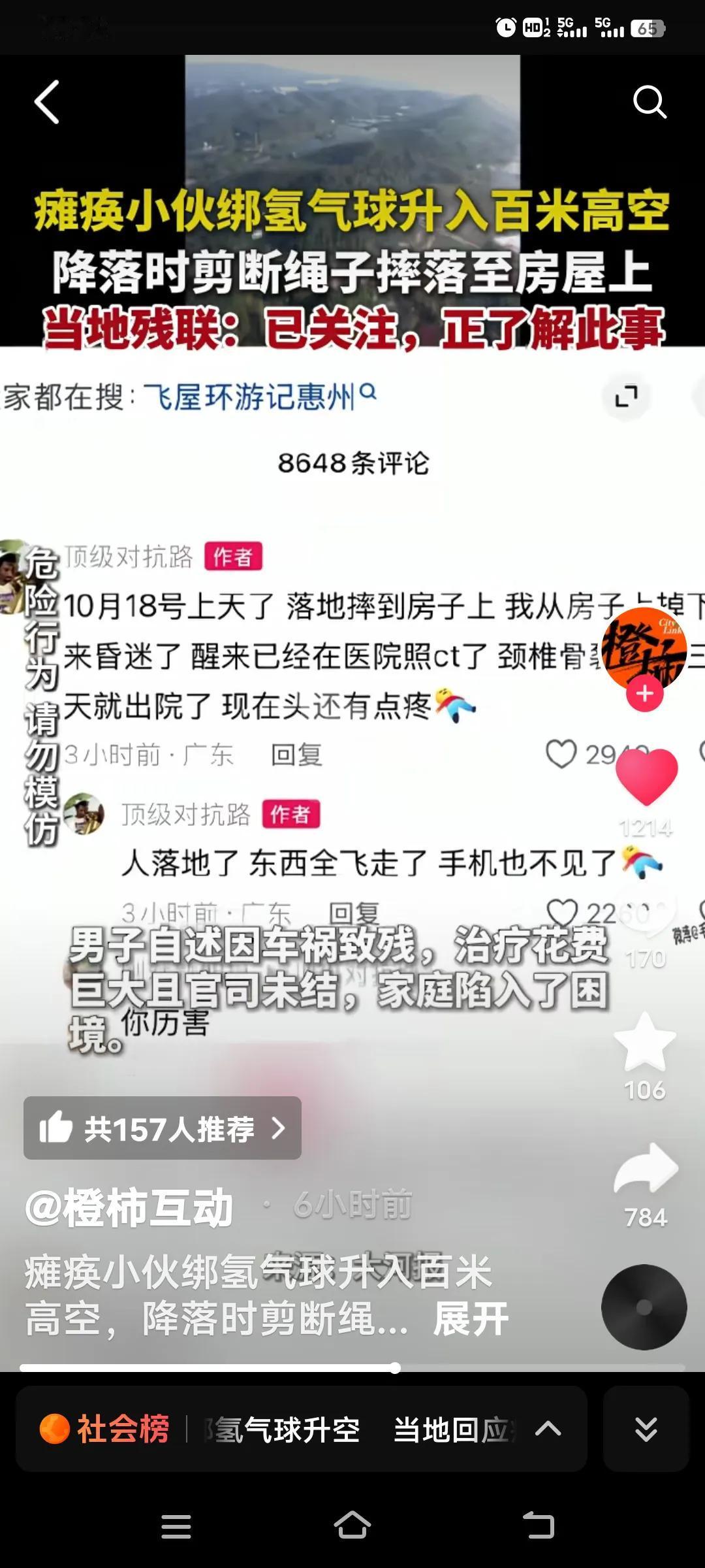广东有位瘫痪小伙绑着氢气球升空,那惊险场景实在让人揪心!氢气球升到百米高空后,他剪断绳子,随后摔落在了房屋上。他坦言自己没想到还能不能活着回来。 他说自己瘫痪让家里花了几十万,官司还没了结,司机负全部责任。他不想一直穷困潦倒,一心想出人头地。对此,有的网友认为他勇敢,也有人说他够狠。 我觉得他挺有想象力的。这件事引发了网友的热烈讨论,还登上了社会榜。他本就瘫痪在身,这次又摔得这么严重,会不会对身体造成更大的伤害呢?目前,当地政府已关注到此事。帮帮他吧,他才20岁!好好活下去,毕竟人生没有重来的机会! 氦气飘气球 带轮子走路气球 氢气球爆燃事故