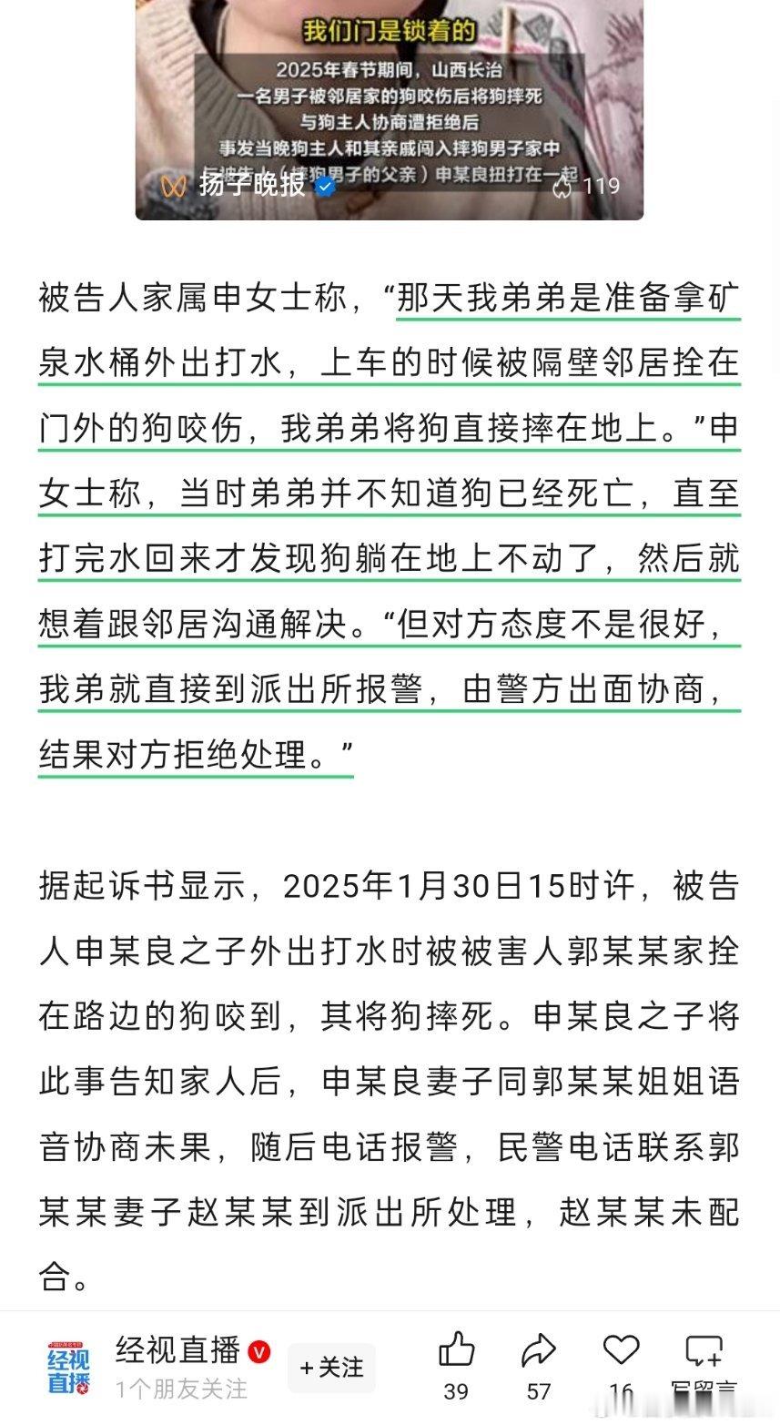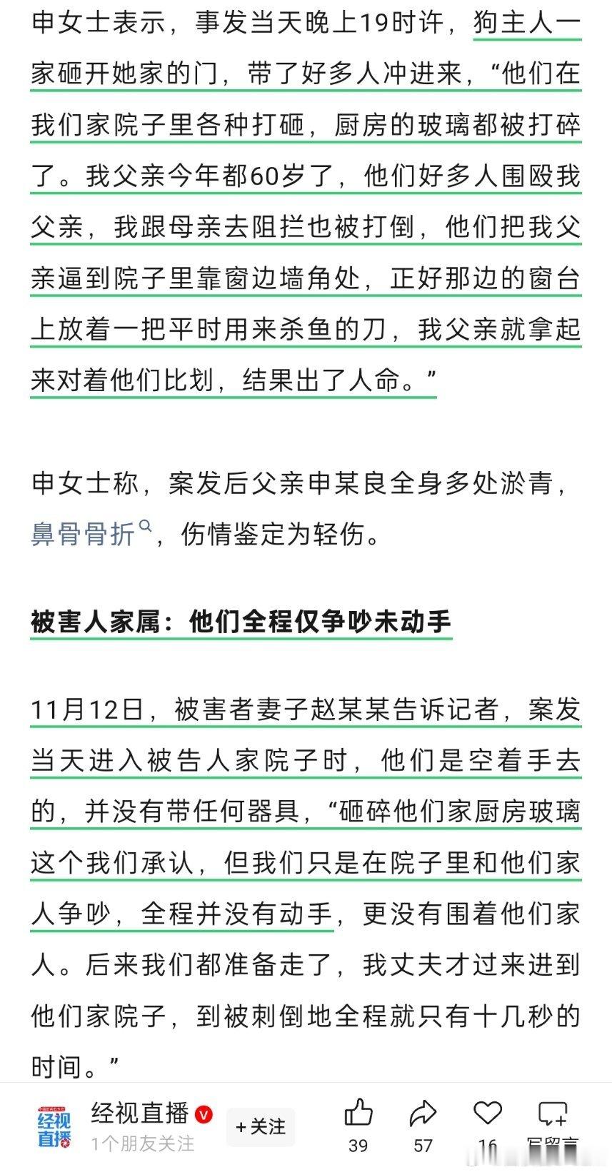 看了下新闻报道,这不就是正当防卫吗?据媒体报道,事发前,就是邻居家里的孩子被狗咬伤了,然后孩子摔狗,发现狗躺在地上不动了,就通过报警正规渠道解决问题,但对方不配合,拒绝处理,还带着一群人上门闹事。狗主人拒绝通过正规渠道解决问题,狗主人还带着一群人拿着武器跑到别人家里打砸,在门锁着的情况下,破门而入,强闯民宅。带着铁锹、棍子、砖头、石头等武器把别人家的窗户全砸了。这群人还围殴邻居家的父亲,邻居家的父亲拿院子里的刀乱刺,结果出了人命,狗主人失血过多身亡。而且,邻居家还报了五次警,当地出警速度太慢了。如果这都不算正当防卫,那大家在自己家里就很难有安全感了。如果这事发生在美国,那邻居家必然属于正当防卫。