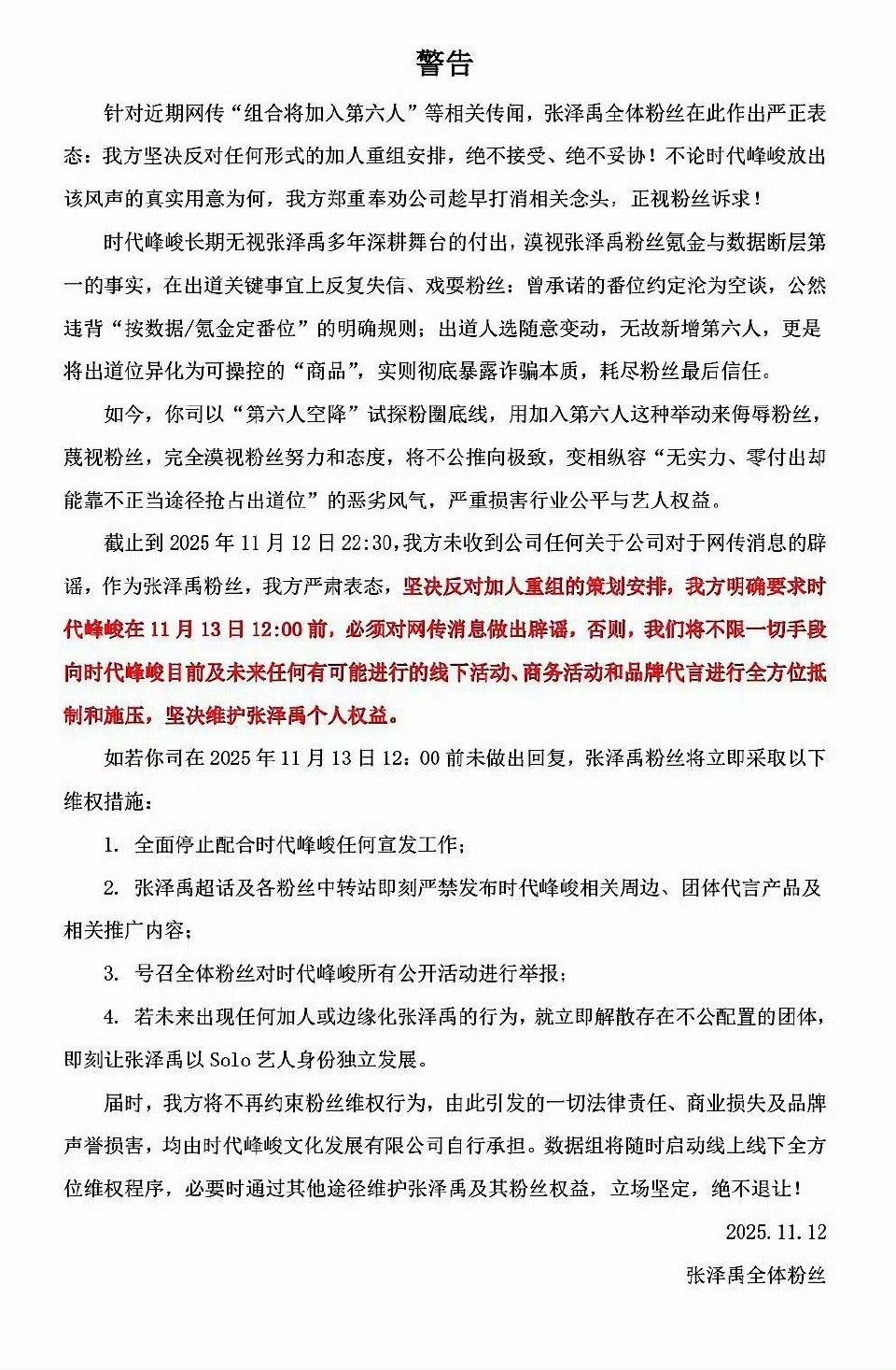 张泽禹粉丝发声明:粉丝坚决维护张泽禹利益,粉丝反对团队加人