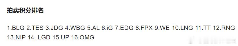 聊完中下,竞拍的那个积分排名大家应该都看到了。说一个大家不知道的,只有两支队伍积分突破60分,第一名BLG唯一八十多分,第二名TES唯一六十多分。