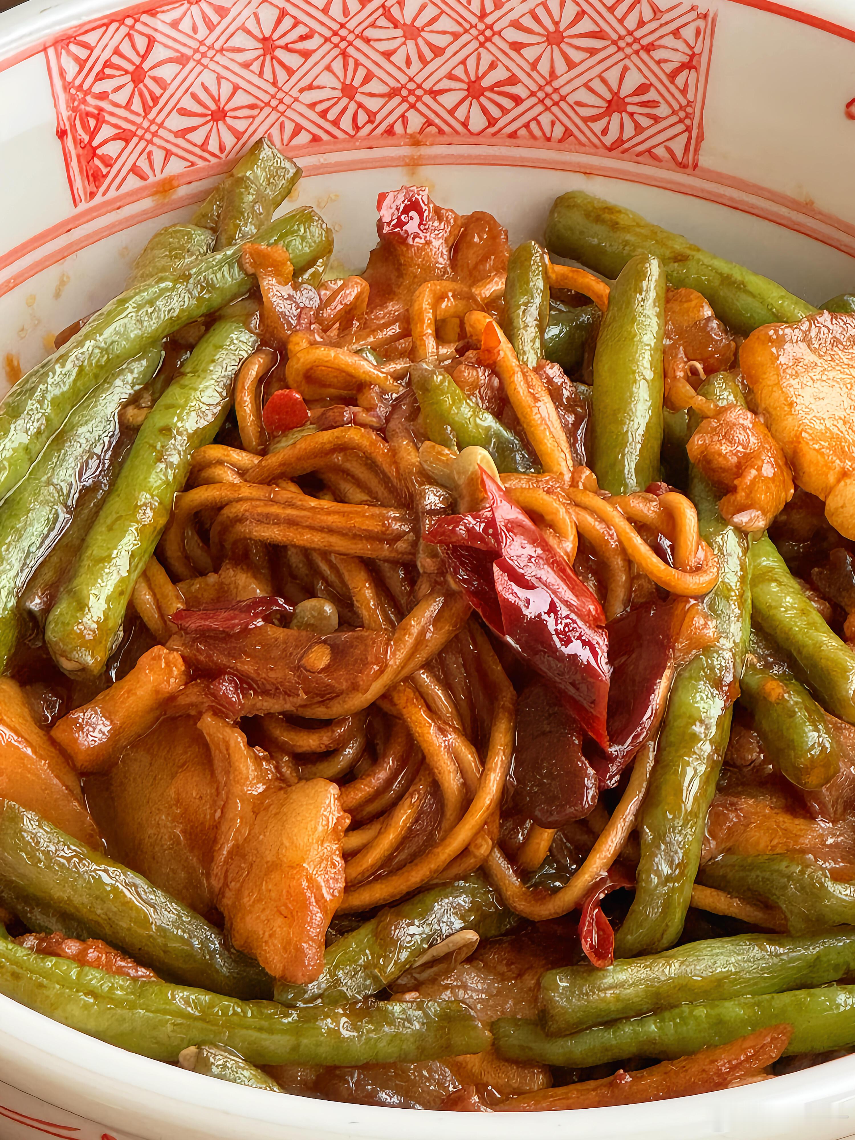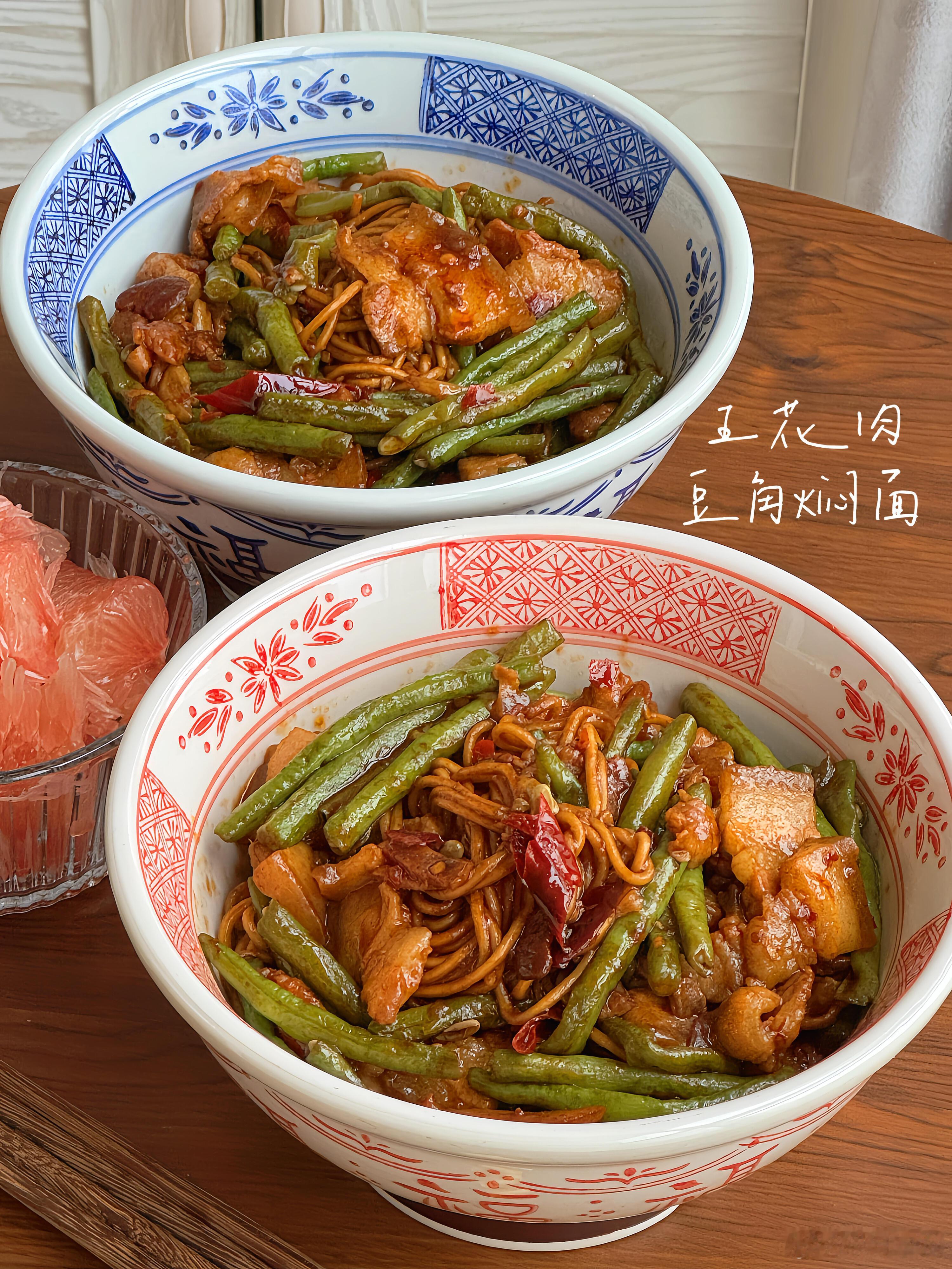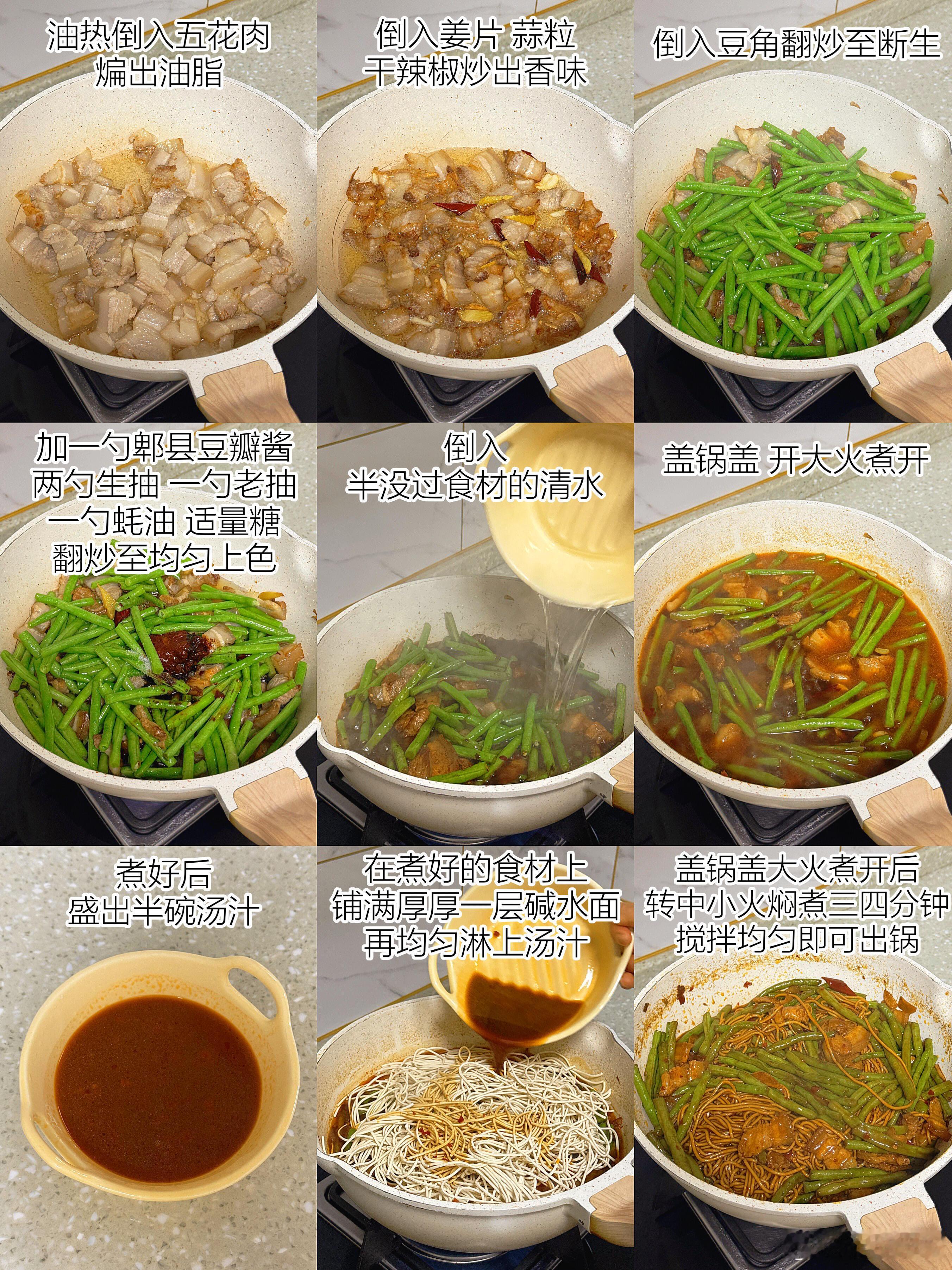 降温天不想吃外卖?那就试试这道五花肉豆角焖面🍝,绝对能让你幸福感爆棚!每一根面条都吸饱了浓郁的汤汁,咸香中带着微微的辣味,豆角的清新与五花肉的醇厚完美融合,吃上一碗,既有肉又有菜,满满当当的满足感,让你直呼过瘾🤤下面就把详细教程分享给大家👇,快来做上一大锅,好好犒劳一下自己吧!【五花肉豆角焖面】🥩食材准备:五花肉、豆角、碱水面、姜、蒜、干辣椒📝具体步骤:1. 先将锅烧热,倒入少许油,待油热后放入五花肉片。慢慢煸炒,直到五花肉的油脂被逼出,这样可以让五花肉吃起来更香,而且不会过于油腻。2. 放入姜片、蒜粒和干辣椒,与五花肉一起翻炒。姜蒜的香味和干辣椒的辣味瞬间被激发出来,为这道菜奠定了浓郁的味道基础。3. 倒入豆角继续翻炒,直到豆角断生。豆角的清脆口感在此时逐渐变得软糯,吸收了肉香和调料的香味。4. 加入一勺郫县豆瓣酱,两勺生抽、一勺老抽、一勺蚝油以及适量的糖。翻炒均匀,让每一根豆角和每一片五花肉都均匀上色,丰富的酱料赋予食材诱人的色泽和醇厚的味道。5. 接着倒入半没过食材的清水,盖上锅盖,开大火将其煮开。让食材在水中充分炖煮,释放出各自的香味,相互交融。6. 煮好后,小心地盛出半碗汤汁放在一旁备用。这半碗汤汁可是一会儿焖面的关键。7. 在煮好的食材上均匀地铺上厚厚一层碱水面,然后再把刚才盛出的汤汁均匀地淋在面条上。8. 再次盖上锅盖,大火煮开后转中小火,焖煮三四分钟。这个过程中,面条会慢慢吸收汤汁,变得软嫩入味。时间一到,搅拌均匀,一道美味的五花肉豆角焖面就大功告成啦!
