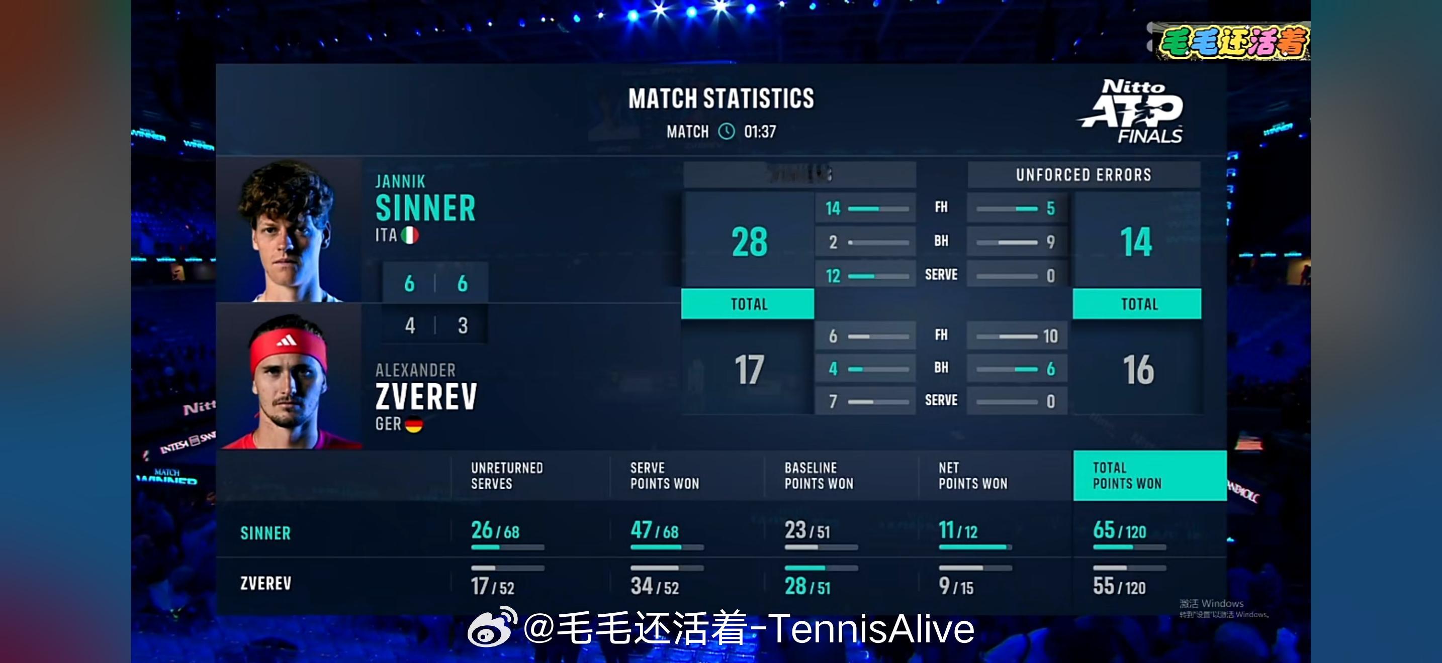 28记制胜分、只有14记非受迫性失误。关键分的ace球多次帮助辛纳化解危机。两个人的水平差距也是越来越大。因为虽然都是顶尖球员,但是在关键的表现还是有所差距。✅5连胜兹维列夫✅年终总决赛7连胜✅室内硬地28连胜