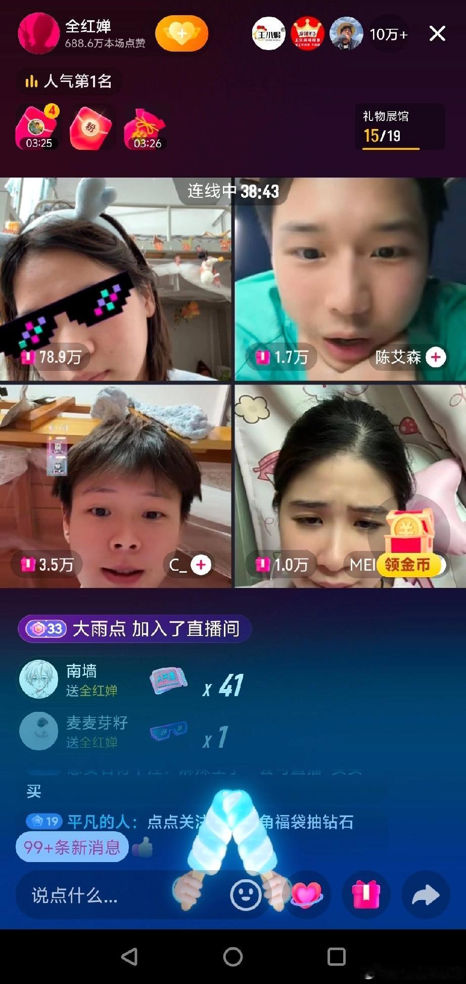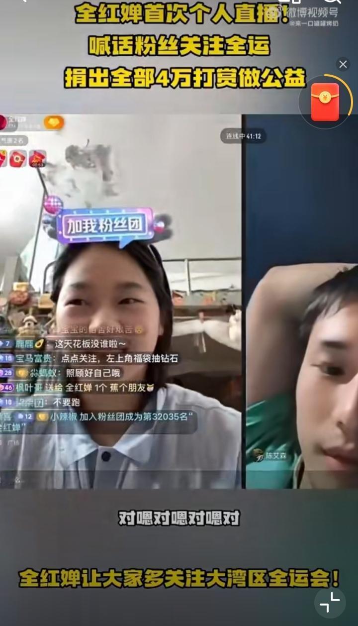 昨晚全红婵和队友一起在抖音直播了[笑哭]! 第15届全运会跳水项目的比赛昨天结束了,全红婵和她广东队的队友陈艺文、陈艾森、梅颖芯连麦聊天直播。 这场临时起意的直播持续了半个小时,首次进行直播的全红婵还不太熟练,不知道要关闭礼物打赏通道,于是产生了43598.60元的收益,但直播结束后。她就把这些粉丝打赏的钱一分不留捐给了中国乡村发展基金会。 直播时看到婵宝宿舍的床是双层铁架床,这应该是广东队跳水队的配置,和现在的大学校园里的宿舍很像。 一场临时的30分钟连麦,900多万观看,打赏全部捐赠,为全红婵点赞[赞]! 让我们和全红婵一起成为更好的人吧。