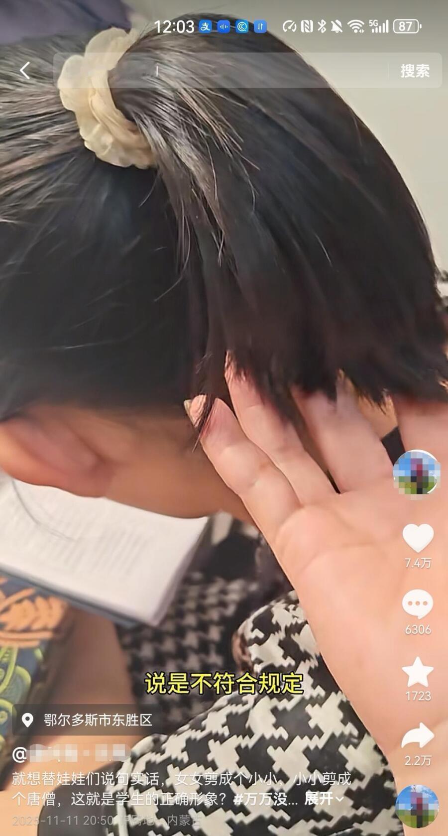 最近,内蒙古鄂尔多斯一位母亲吐槽女中学生统一剪短发的视频火了,10多个小时转评赞超10万。她女儿留着合规的短马尾,仍被指不符合规定,还扣了班分和学分。这位母亲觉得,学校为管理和学习让学生剪短发能理解,但也该听听孩子想法。短发睡一觉就乱,早上洗头吹干得20分钟,这剥夺孩子生活权利、压抑个性,孩子情绪反抗还得家长安抚。 有网友觉得学校初衷好,短发方便打理;也有人认为扎马尾才方便。学校和教体局已关注此事,教体局称规定是为营造氛围、减少攀比、助学生专注学业,会核实情况。希望能平衡好管理与学生个性发展。
