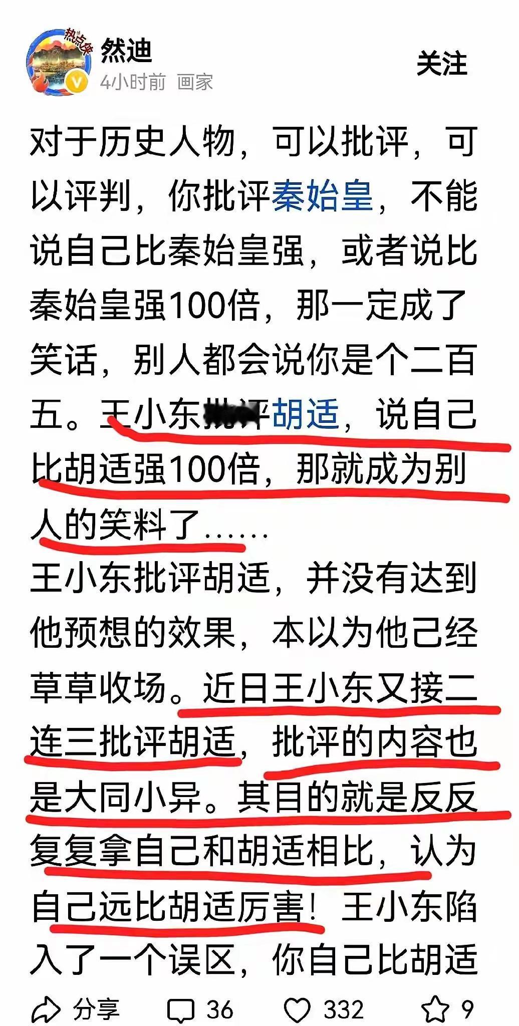 【太阳是如何陨落?】 有人说王小东批胡适,为何盯着自己的前任校长不放?正是批胡适导致粉丝断崖式下跌。 也让王小东指责这群胡言乱语的人是鸡,是狗,总以为自己把太阳鸣起吠落? 其实,王小东流量断崖式下跌是2023年5月到6月,资本也就是平台一项重大改革引发的结果。 导致王小东流量断崖式下跌,但无论怎么说,这次王小东选择话题批胡适是彻底失败了,也只能草草收场,这次王小东事件提醒我们在没有话题时候要耐得住寂寞,等待下一次暴风雨来临。 如果想标新立异,那就要慎重考虑,这次王小东就是急于求成,当然民间议论纷纷造成一定土壤也影响王小东的判断。 吸取教训,开拓创新