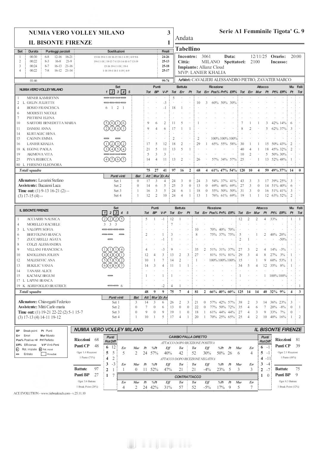 【意甲女排诺瓦拉3-2险胜瓦莱福里亚 米兰3-1佛罗伦萨】 11月12日,意甲女排第9轮,诺瓦拉主场3-2(25-16/25-21/20-25/16-25/15-13)险胜瓦莱福里亚,MVP石川真佑20分、阿尔斯迈尔18分、拜延斯13分、米姆斯和博尼法西奥各10分,奥莫鲁伊26分、比希22分、乔瓦尼尼11分。米兰主场3-1(24-26/25-13/25-18/25-17)击败佛罗伦萨,埃格努21分、MVP拉涅尔17分、皮瓦14分、阿基莫娃伤愈替补出场得到5分,布吉里奇14分、诺尔玛12分、马勒舍维奇10分。