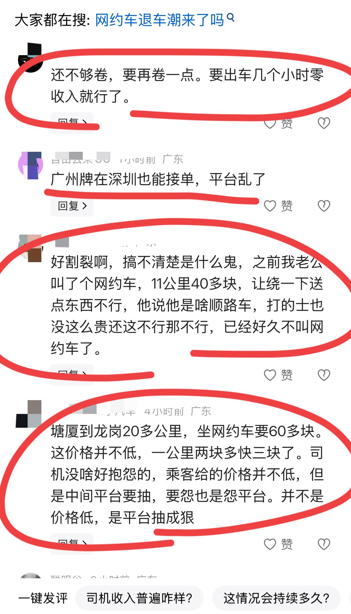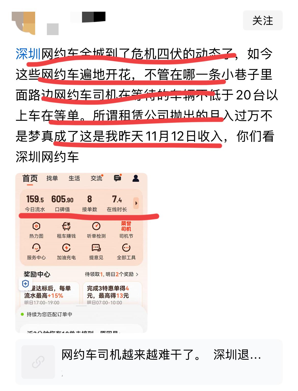 网友爆料:网约车越来越难跑了!! 据网友爆料,某一线大都市,退车率达到37%,抽成已经高达30%~ 时薪降到创纪录的16元!! 租车费说是说封顶3500; 但租车公司还是要收3800元每月; 如果是油车跑,每公里1.8元成本,而且各种奖励没有了。 稍有差评单就没有了,高峰期的奖励也降了4成。 能咋办呢? 有人转行去跑众包外卖,时间是自由了,收入更没谱; 去工地,日薪250,保险没着落。 太难了,他感叹,这是系统新的积挤压,非个人能挽回了。 支撑一个5分好评,是一个人的数年如一日的时间和健康。 这便利,谁来买单呢? 有这个一线大都市的网约车司机回复: 遍地开花,危机四伏!! 这是他昨日跑了7个多小时的流水,接了8单,收入159.5元。 如何呢? 看来还是每天要跑12小时,甚至是14小时,才能突破300元大关了。 底层都奋斗在这些吉祥三宝行业,聊以糊口。 网友是这么来评论的,看了有什么感受吗。 问题出在哪里呢,其实收入并不低,单签去哪里了呢? 现在赚钱真的太难了,经济何时能恢复,就业何时能提升呢?