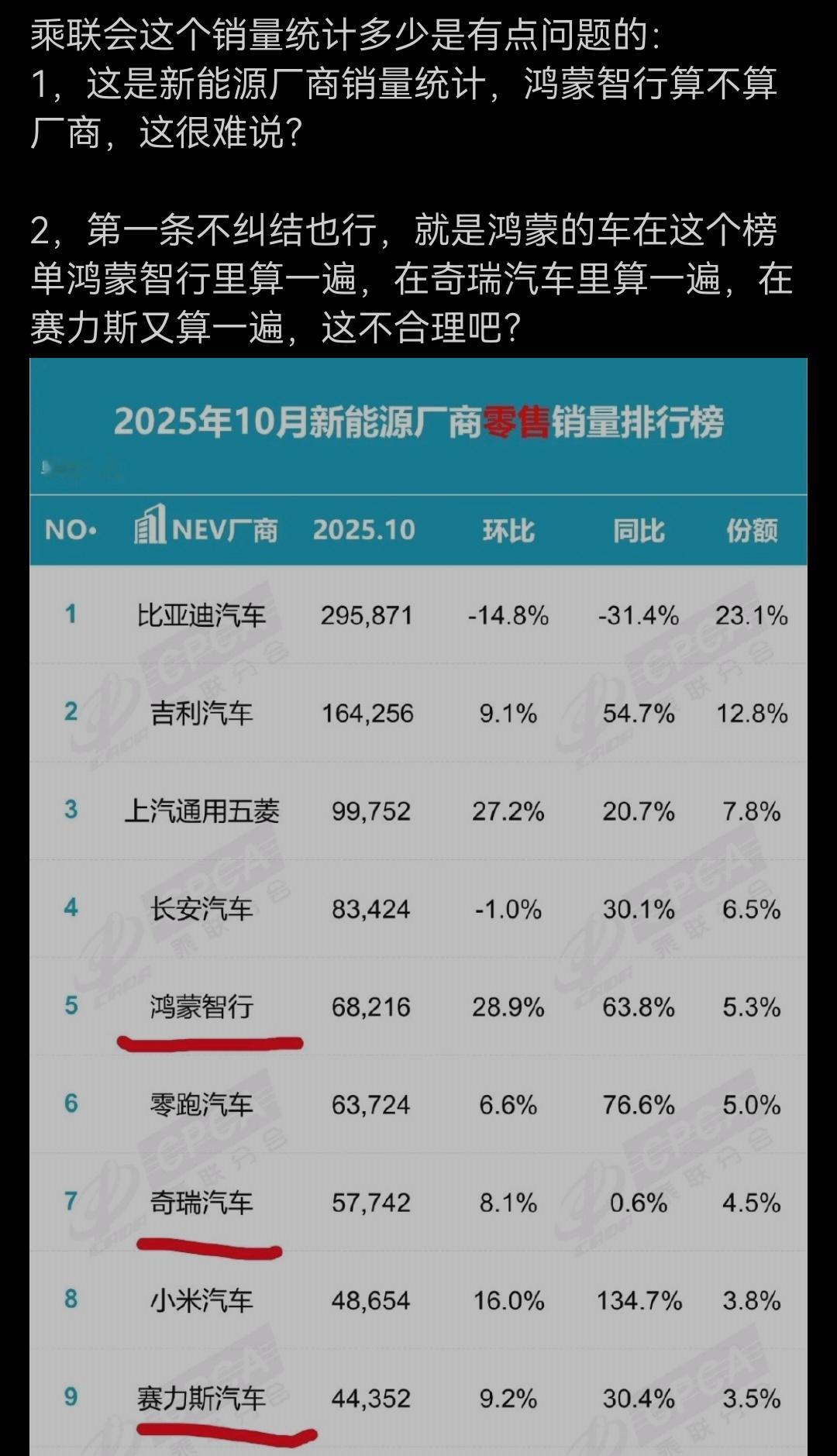 鸿蒙智行已经差不多3年了,普通网友都能理解的东西,汽车博主怎么还装傻充愣呢?宁可质疑乘联会也不愿意承认鸿蒙智行获得的成绩。这个表格只是展示作为品牌厂商这个月分别卖了多少车,并不是计算月度所有销量的总和,没有重复计入五界的销售数据在月初发战报的时候,也是鸿蒙智行发一份,奇瑞和赛力斯也发一份。如果只有鸿蒙智行自己发,赛力斯和奇瑞的数据人家不需要公示一下?一个逻辑拐个弯就想不通了?有些自己都是鸿蒙车主的博主,连这个也理解不了,看来也没怎么把鸿蒙智行当回事