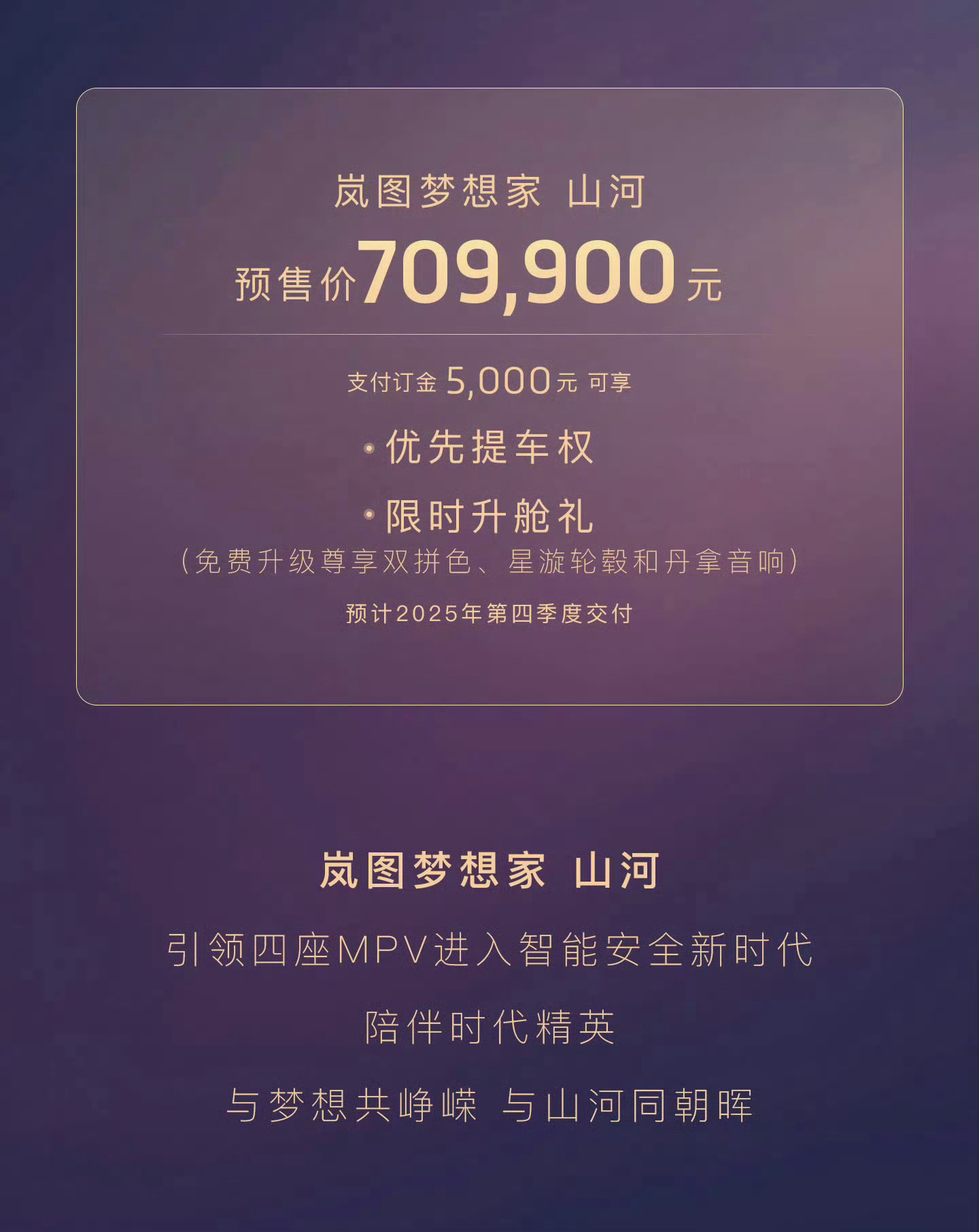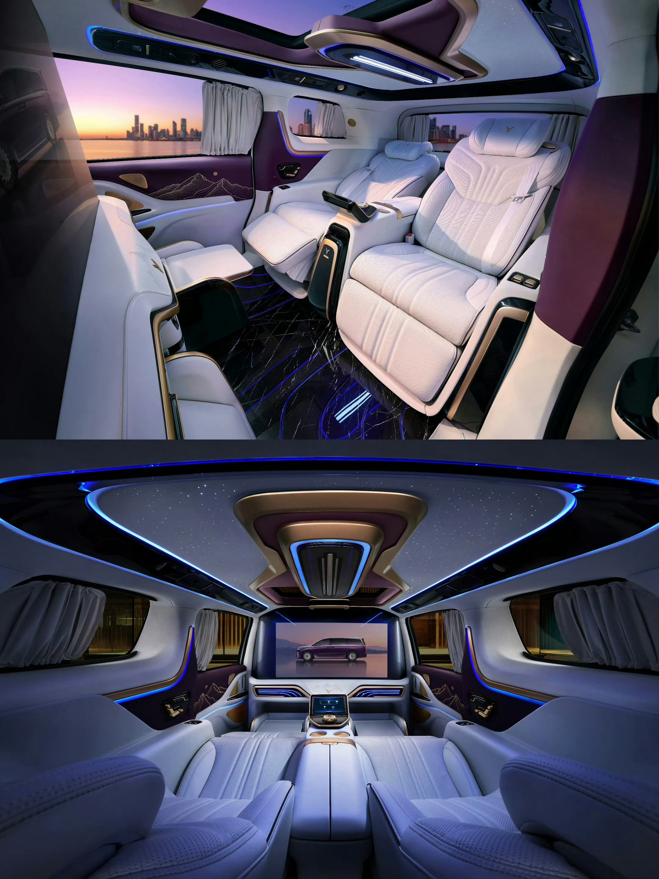 岚图梦想家的四座版——山河,差不多对标的是极氪009光辉内部装修很KTV,之前的预售价是70.99万