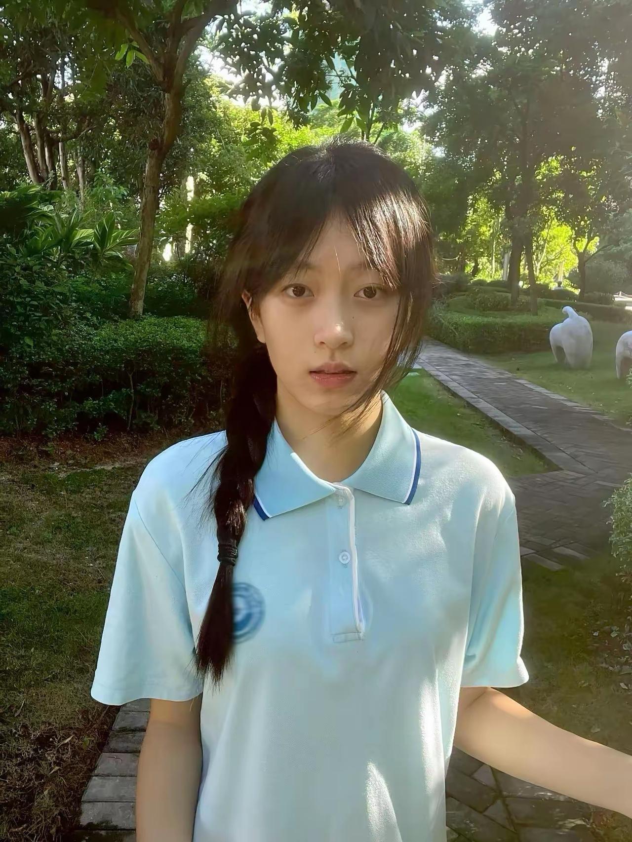 浅蓝校服浸着夏的光斑,麻花辫勾着风的软。林荫道的绿意漫过来时,恰好接住这帧清透的少年气。