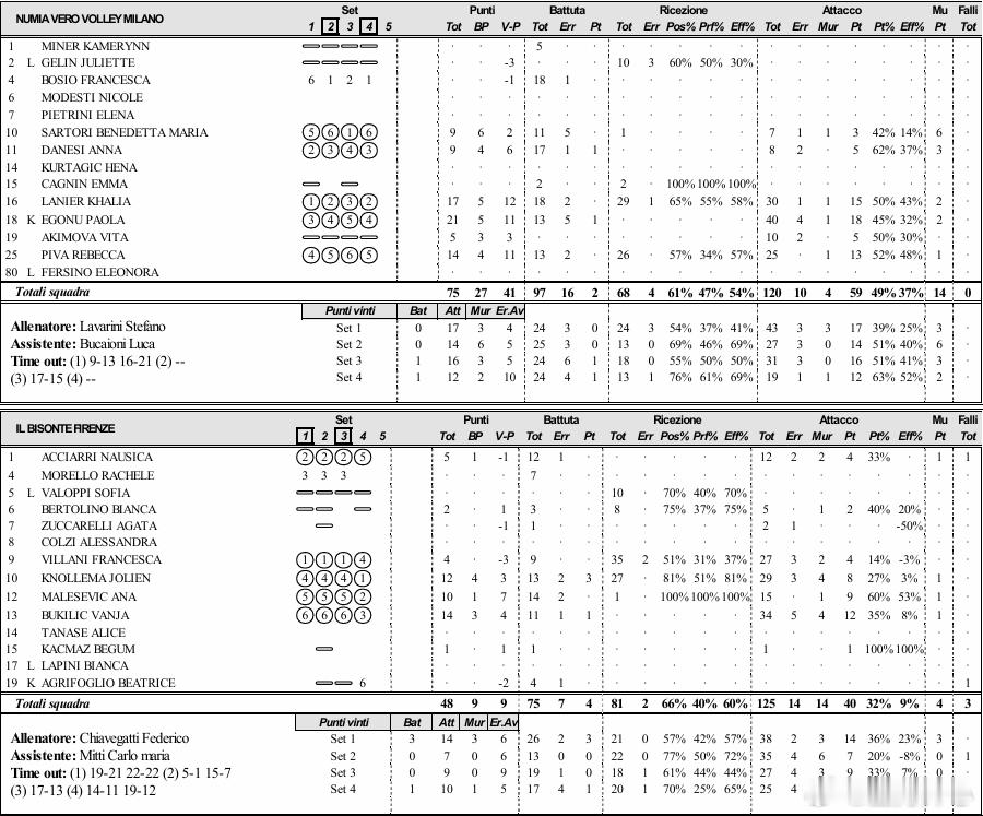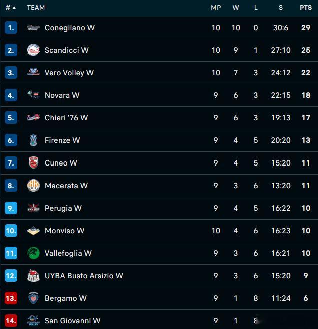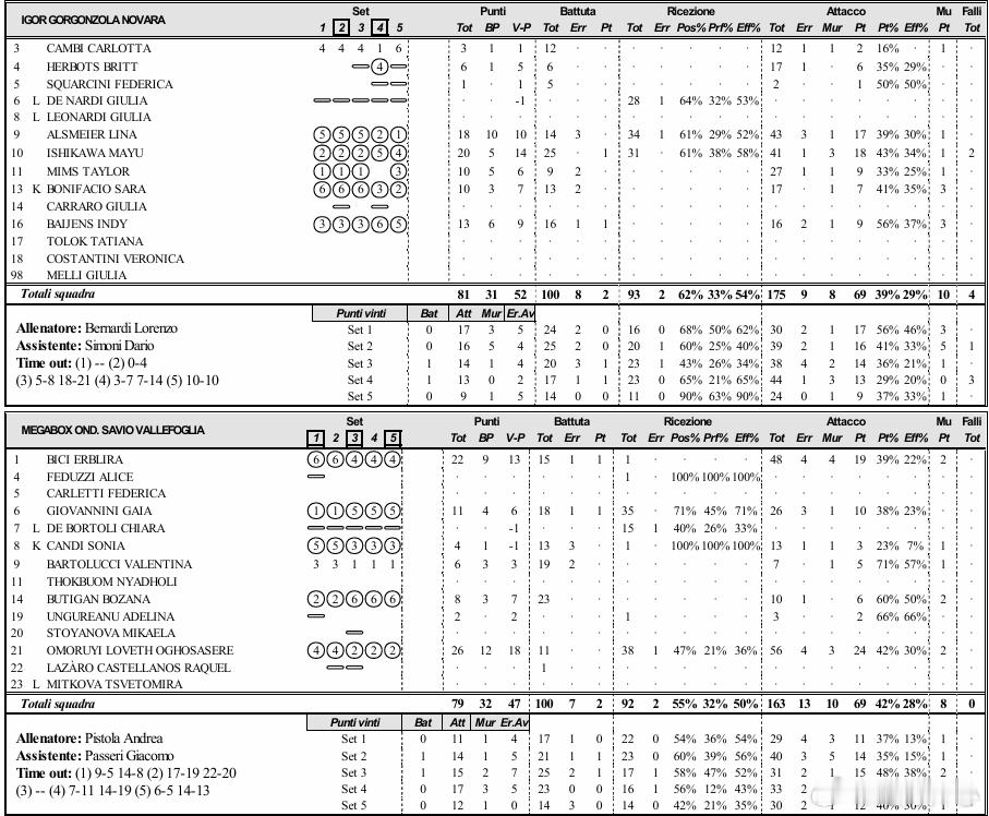 意甲第九轮四大豪门比赛技术统计表 马切拉塔0-3科内利亚诺16-25/12-25/26-28MVP卢比安11分(14扣10中1发)加比16分、哈克11分、奇妃11分、尼卡8分斯坎迪奇3-0基耶里26-24/25-22/25-17MVP斯金纳15分(25扣15中20一传2失误)安娃20分、魏策尔11分、波塞蒂6分基耶里内梅斯22分米兰3-1佛罗伦萨24-26/25-13/25-18/25-17MVP拉尼尔17分(30扣15中1失误1被拦2拦29一传1失误)艾格努21分、皮瓦14分、萨托利达内西各9分.佛罗伦萨布吉里奇14分、科诺尔莱玛12分;诺瓦拉3-2瓦莱福利亚25-16/25-21/20-25/16-25/15-13MVP石川真佑20分(41扣18中1失误3被拦1拦1发31一传)阿尔斯迈尔18分、拜岩斯13分、米姆斯和博尼法西奥各10分瓦莱奥莫鲁一26分、比奇22分、乔瓦尼尼11分