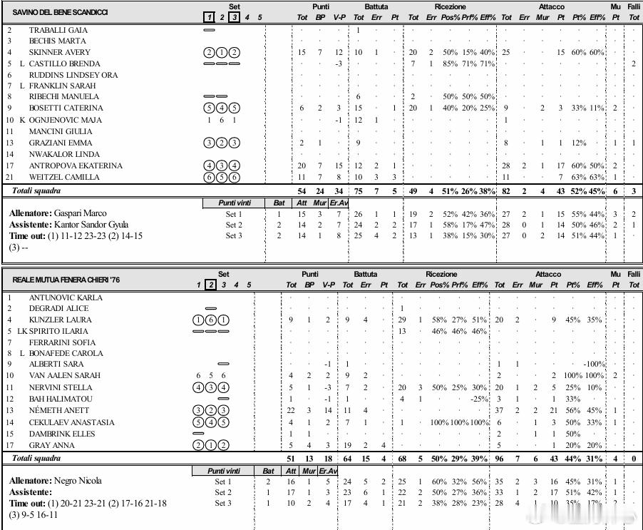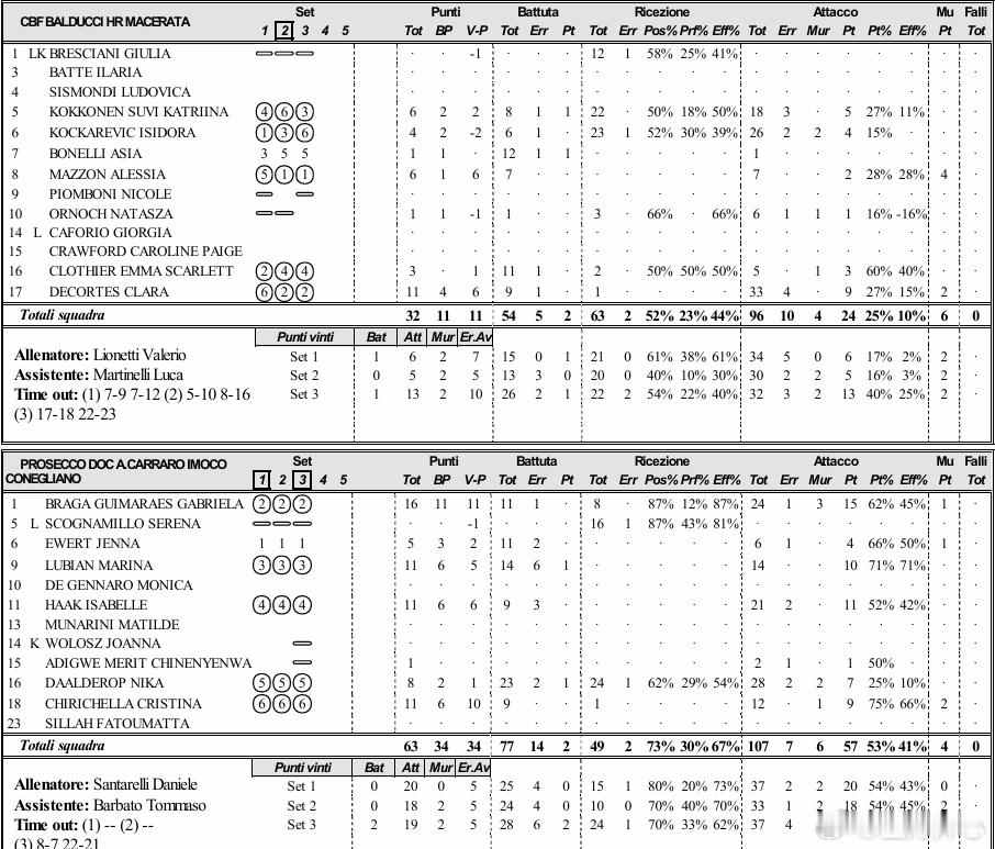 意甲第九轮四大豪门比赛技术统计表马切拉塔0-3科内利亚诺16-25/12-25
