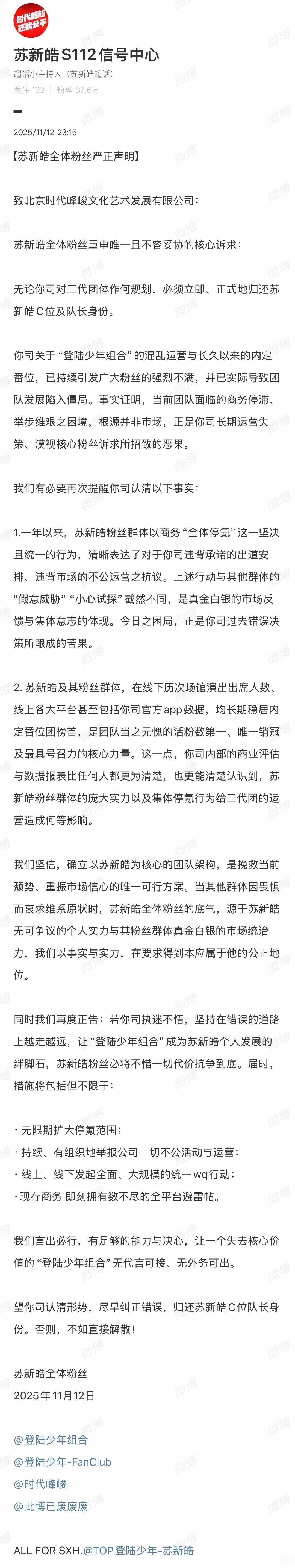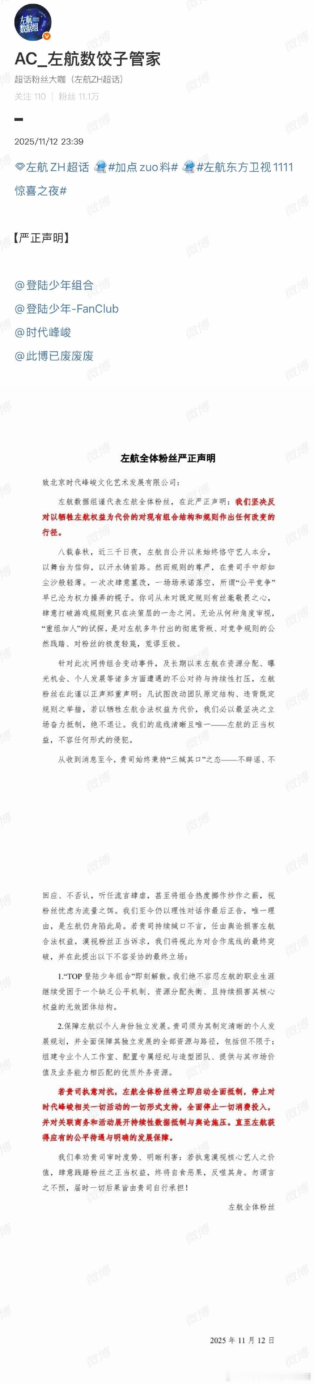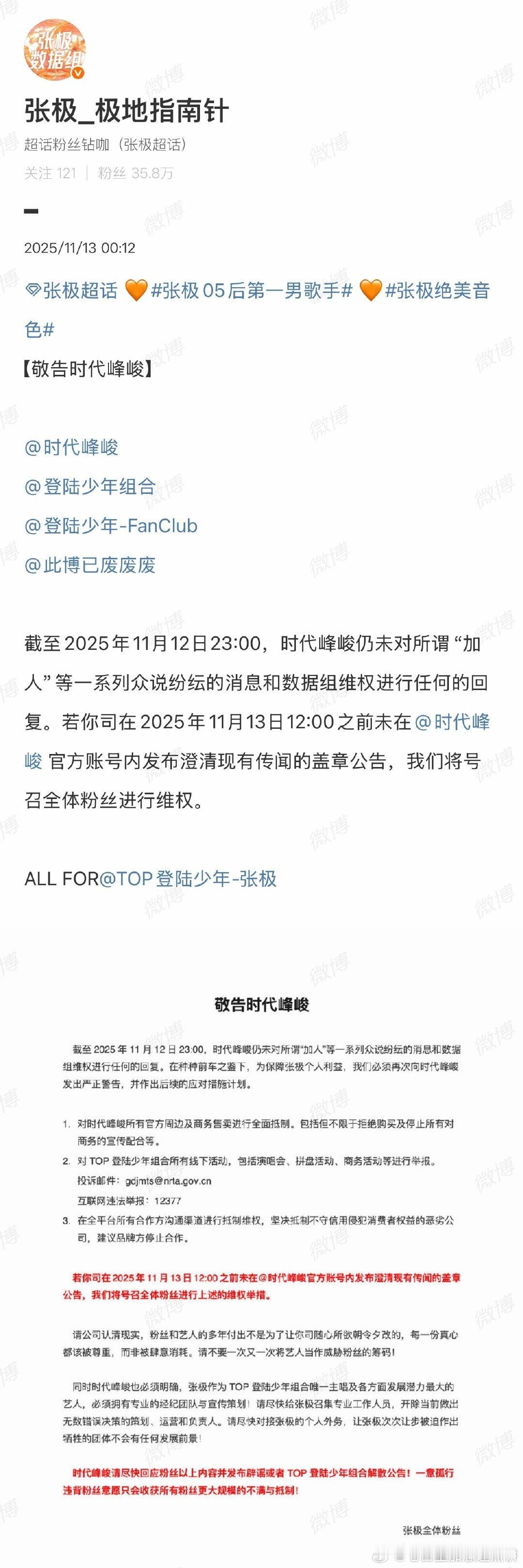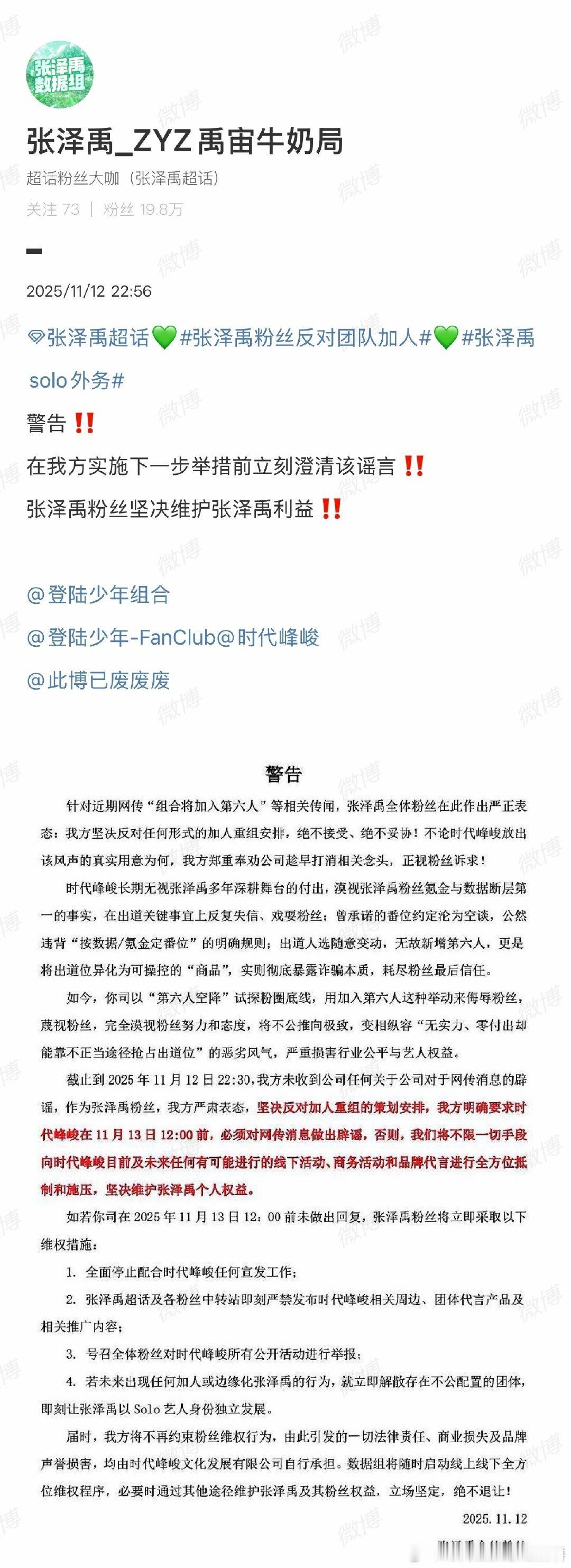 朱志鑫后援会发布告时代峰峻书,要求公司对网传组合人员及站位的变动做出辟谣回复