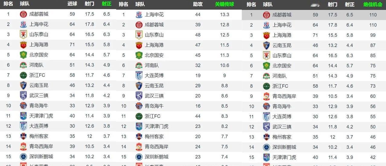 本赛季中超各项技术统计和数据,成都可惜了,失球最少却不是冠军。 从各项数据来看今年上港能拿这个冠军还真的要感谢同行的让贤。 记得去年上港在中超的所有数据都是遥遥领先,绝佳机会,威胁传球,射门,进球…..今年全面下滑,但还是夺冠,只能说这个联赛对手实在太菜了。 话说这榜单天津是真牛逼,42个绝佳机会进40个转化率,都快接近百分百了,厉害!