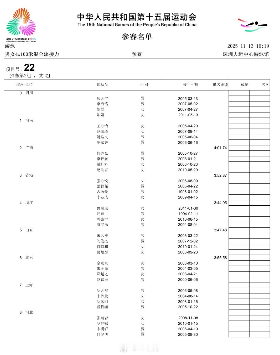 男女混合混接预赛阵容 浙江:鲁星辰、汪顺、周鑫垟、潘展乐