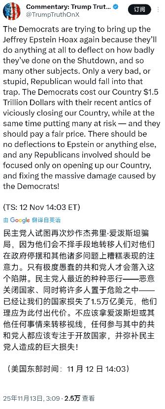 美国总统特朗普今天(北京时间11月13日)愤怒地写道:“民主党人试图再次炒作杰弗里·爱泼斯坦骗局,因为他们会不择手段地转移人们对他们在政府停摆和其他诸多问题上糟糕表现的注意力。只有极度愚蠢的共和党人才会落入这个陷阱。民主党人最近的种种恶行——恶意关闭国家、同时将许多人置于危险之中——已经让我们的国家损失了1.5万亿美元,他们理应为此付出代价。不应该拿爱泼斯坦或其他任何事情来转移视线,任何参与其中的共和党人都应该专注于开放国家,并弥补民主党人造成的巨大损失!”   特朗普觉得民主党这招太损了,为了掩盖自己在政府停摆这事上的糟糕表现,啥手段都使得出来。政府停摆可不是小事,这期间好多公共服务都受影响,民众生活也诸多不便。民主党作为执政党,没把精力放在解决问题上,反而搞这些歪门邪道,特朗普自然看不下去。   他还特别提醒共和党人,千万别被民主党带进沟里。在特朗普看来,只有那些脑子不好使的共和党人才会跟着民主党的节奏走,被他们的炒作牵着鼻子。共和党这时候应该保持清醒,把重点放在解决实际问题上,而不是跟着民主党一起瞎折腾。   说起民主党在政府停摆这事上的表现,特朗普那是一肚子火。他直言民主党恶意关闭国家,这可不是夸张的说法。政府停摆期间,好多政府部门关门大吉,工作人员停职在家,一些重要的项目和计划也被迫搁置。这不仅影响了国家的正常运转,还让很多人的生活陷入困境。   就拿那些依赖政府补贴的家庭来说,政府停摆期间,补贴没了,他们的生活立马就捉襟见肘。还有那些等待审批签证、办理业务的人,因为政府部门关门,他们的计划全被打乱,损失惨重。特朗普说民主党把好多人置于危险之中,这话一点都不为过。   而且,特朗普还指出,民主党的这些恶行让国家损失了1.5万亿美元。这可不是个小数目,1.5万亿美元相当于好多国家一年的GDP了。这些损失体现在各个方面,经济增速放缓、企业投资减少、就业机会流失等等。民主党作为执政党,本应该带领国家发展经济、改善民生,结果却搞出这么一出,让国家遭受这么大的损失,特朗普觉得他们必须得付出代价。   特朗普强调,现在不是拿爱泼斯坦或者其他事情来转移视线的时候。爱泼斯坦事件虽然备受关注,但和政府停摆、国家损失这些大事比起来,根本就不是一个量级的。民主党想用爱泼斯坦事件来掩盖自己的问题,这是不可能得逞的。   特朗普呼吁参与其中的共和党人,要把精力放在开放国家上。政府停摆不能一直持续下去,得尽快恢复正常运转,让国家重新回到发展的轨道上。而且,共和党还得和民主党算算账,弥补他们造成的巨大损失。这损失可不是一天两天就能弥补回来的,需要共和党和民主党一起努力,制定出有效的政策和措施。   其实,民主党和共和党之间的争斗由来已久。两党在很多问题上都有不同的立场和观点,经常为了争夺政治利益而互相攻击。这次政府停摆事件,就是两党争斗的一个缩影。民主党想通过一些手段来打压共和党,结果却弄巧成拙,让国家陷入了困境。   而特朗普作为共和党的重要人物,自然不会坐视不管。他站出来发声,一方面是为了维护共和党的利益,另一方面也是为了提醒民主党,不要把国家利益当成儿戏。国家的发展需要两党共同努力,而不是互相拆台。   现在,美国民众也对两党的争斗感到不满。他们希望两党能够放下分歧,一起解决国家面临的问题。政府停摆、经济受损、社会不稳定,这些都是民众关心的大事。两党如果继续争斗下去,只会让问题越来越严重,最终受害的还是广大民众。   特朗普的这番言论,也引起了国际社会的关注。很多国家都在看着美国,看两党如何解决这次危机。美国作为世界大国,其国内的政治稳定和经济状况对全球都有重要影响。如果美国一直陷入两党争斗的泥潭,无法自拔,那么全球的经济和政治格局也可能会受到影响。   所以,民主党和共和党都得好好反思一下自己的行为。民主党要认识到自己的错误,停止那些不择手段的炒作,把精力放在解决实际问题上。共和党也要保持清醒,不要被民主党带偏,要和民主党一起努力,让国家尽快恢复正常。只有这样,美国才能走出困境,重新焕发生机与活力。