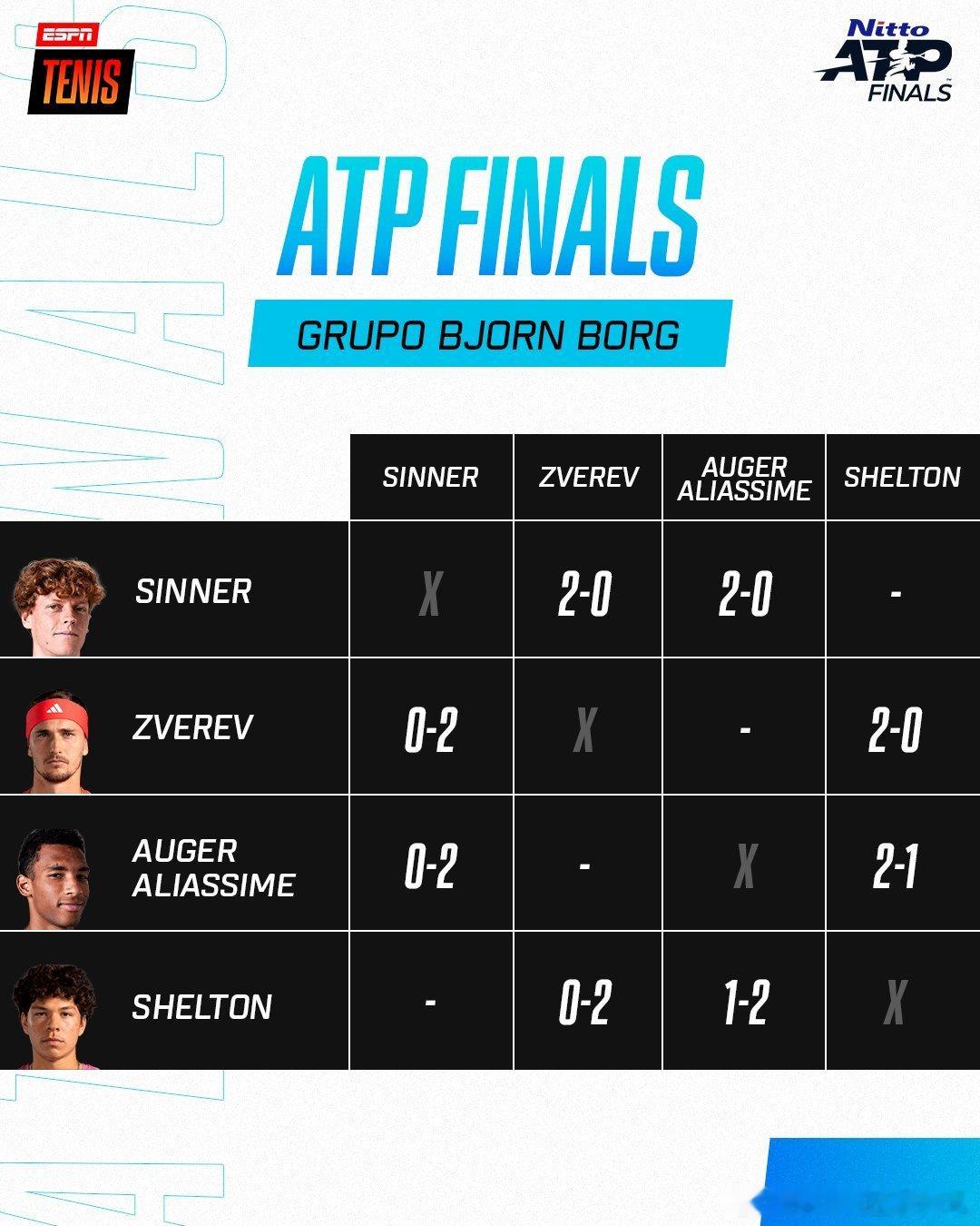 比约·博格小组的晋级形势! 💥🇮🇹辛纳以小组第一率先晋级半决赛 , 🇺🇸谢尔顿被淘汰 🇩🇪兹维列夫和🇨🇦阿利亚西姆将争夺小组第二名。 🔥
