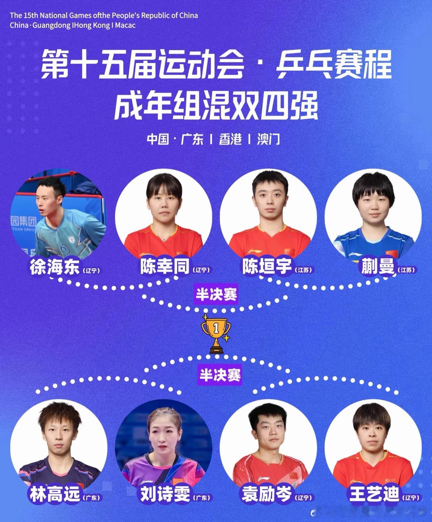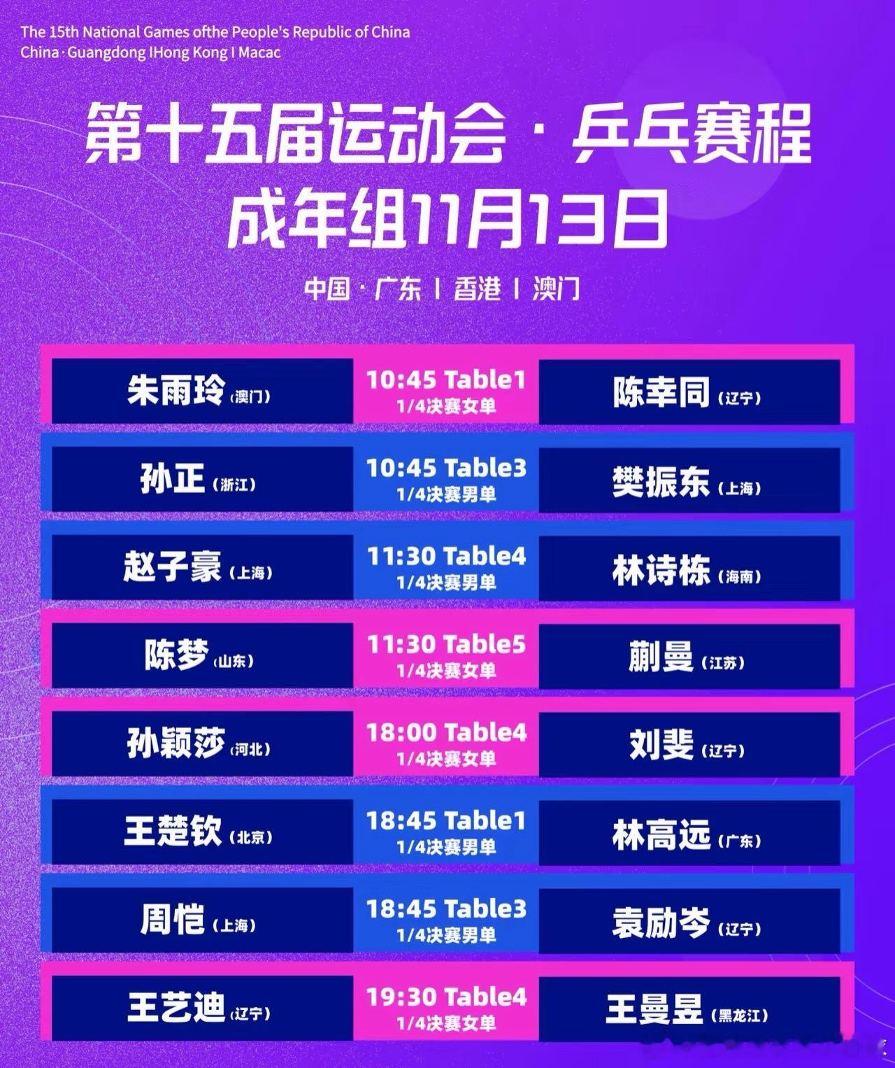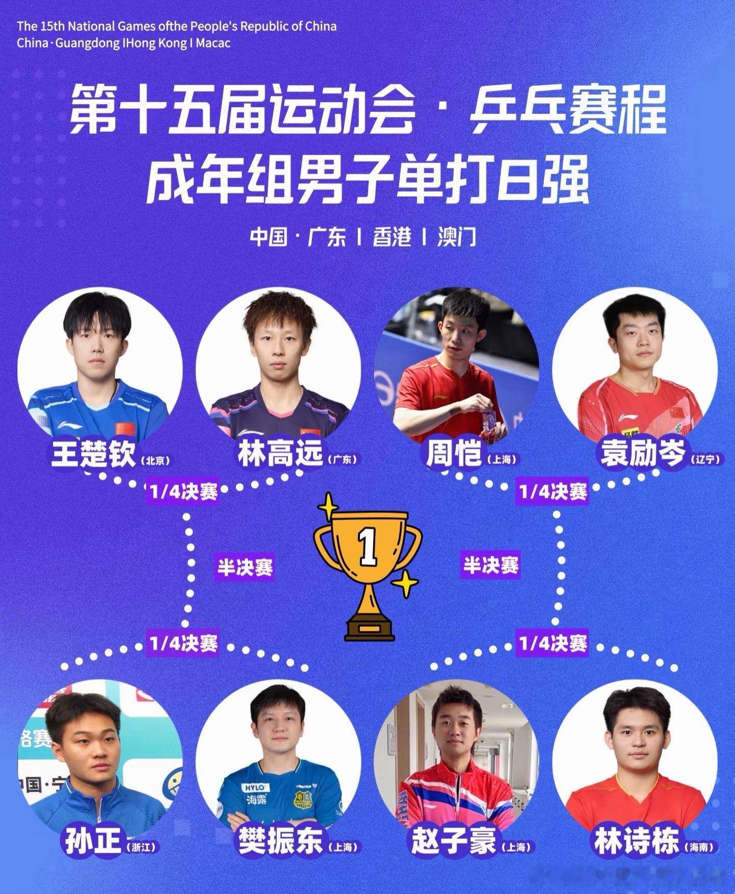 🏓|全运会男女单8强,混双4强,名单清晰版女单成人组8强孙颖莎(河北队)VS刘斐(辽宁队)朱雨玲(澳门队)VS陈幸同(辽宁队)陈梦(山东队)VS蒯曼(江苏挺拔队)王艺迪(辽宁队)VS王曼昱(黑龙江银河队)男单成人组8强王楚钦(北京)VS林高远(广东)周恺(上海)VS袁励岑(辽宁队)孙正(浙江)VS樊振东(上海)赵子豪(上海)VS林诗栋(海南)混双成人组4强徐海东/陈幸同(辽宁)VS陈垣宇/蒯曼(江苏)林高远/刘诗雯(广东)VS袁励岑/王艺迪(辽宁)女单意料之中,男单意料之外