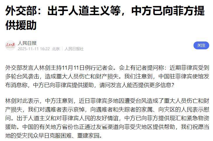 菲律宾小马斯科当局这次会领情吗? 11月11日,中国驻菲律宾使馆通报,中国将向受台风灾害影响的菲律宾人民提供人道援助。中国将向菲人民提供现汇和紧急物资援助,祝愿当地受灾民众早日克服困难、重建家园。 这也不是第一次了,这些年菲律宾遇上大的自然灾害,不管是强台风还是其他灾情,中国总是第一时间伸出援手,要么送救灾物资,要么派救援队过去,实打实帮他们渡过难关。 2013年超强台风“海燕”重创菲律宾时,中国专业救援队携物资千里驰援;2021年台风“雷伊”过后,中国捐赠了4725吨大米和价值800万比索的2万个食品包,大使黄溪连亲自参与交接,菲律宾社会福利部门官员当时就坦言,中国的捐赠来得太及时,直接对接了灾民的迫切需求。 而这次台风“海鸥”和“凤凰”双连击,给菲律宾带来的冲击同样惨重——250多人死亡、359万人受灾,4万多座房屋受损,电力和供水系统大面积瘫痪,中国驻菲使馆11月11日一接到消息就宣布援助,现汇和帐篷、净水设备、药品等物资同步启动,东盟统计显示,中国是首个响应的国家,物资送达速度比其他国家都快。 但对比中国的快节奏援助,小马斯科当局的反应就显得耐人寻味了,那些常跟菲律宾称兄道弟的“传统盟友”,这次似乎集体失声,美国军舰虽有现身,却没带来急需的发动机和大米,日本也未见实质援助动作,这份冷淡与中国的主动驰援形成了鲜明对比。 中国对菲援助向来不带附加条件,2021年送大米时没提过基建合作,这次给现汇也没要求南海问题上的让步,中国驻菲使馆甚至直白表示“就是普通人需要帮忙,立刻伸手”。 可小马斯科政府的后续操作却有迹可循,去年中国刚帮着应对完台风,菲律宾转头就跟美国签署了新的军事合作协议;今年灾害刚过没多久,菲军方又在南海区域开展了巡逻活动,一边坦然接收着来自中国的救灾物资,一边在外交和军事层面保持着针对姿态,这样的行为轨迹,让外界很难不去琢磨“领情”二字。 但中国的援助似乎本就没把“当局领情”作为前提,毕竟援助的核心从来都是受灾的普通民众,小马斯科当局到底会不会领情?答案或许藏在其后续的外交选择里,是继续抱着“靠美国制衡中国”的思路,收下帐篷和大米后依旧在敏感议题上保持强硬;还是能看清谁才是真能雪中送炭的邻居,在对华政策上多些务实考量?从目前的沉默来看,当局大概率还在权衡“拿援助”与“抱美国大腿”之间的平衡。 但无论如何,中国的援助从来不是做给某届政府看的,而是送到那些排队领物资的老人孩子手中,送到那些失去家园的灾民身边,他们的认可与感谢,本就是援助最该收获的回应,至于小马斯科当局这次能不能看清,谁才是真能雪中送炭的邻居,还需要时间验证。