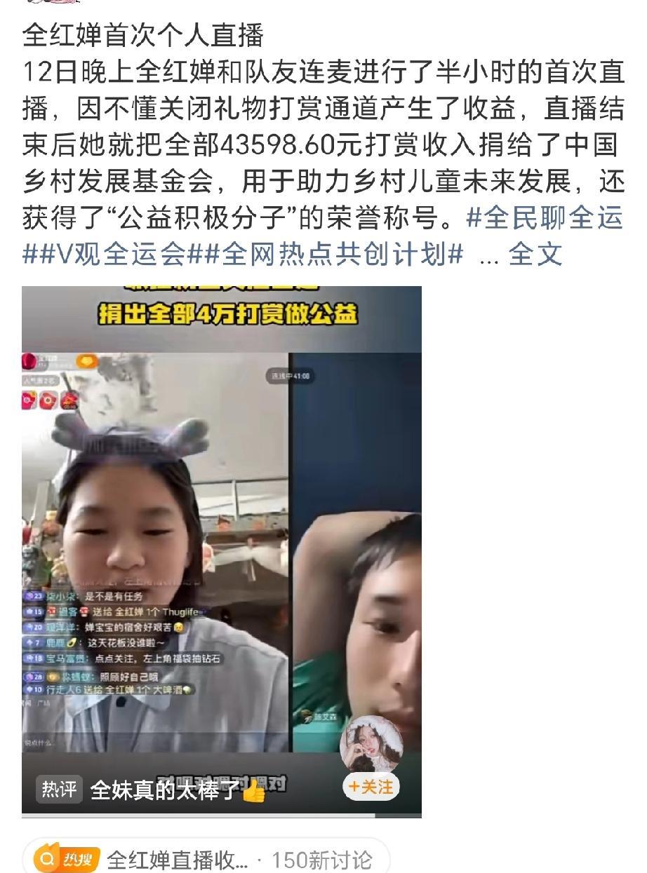 全红婵直播连线队友,分享生活和比赛,真是让粉丝们惊喜又意外。 全运会跳水项目已经结束,又不知道多久以后才能见到可爱的婵宝,这不就是妥妥地给粉丝们发“福利”嘛。 但有些“键盘侠”却不乐意了,跳出来说婵宝这是赚快钱。 天知道,人家婵宝这次是首次个人直播啊,连打赏开关在哪儿都还没弄明白呢。 但打脸也来得飞快。 婵宝一下播,就把直播的全部收益43598.60元捐给了中国乡村发展基金会,用于助力乡村儿童未来发展。 这就是根正苗红、国家严选、连央妈都连连称赞的全红婵啊,永远可以让大家放心。 相信婵宝、支持婵宝,为婵宝点赞! #新锐创作者成长计划#