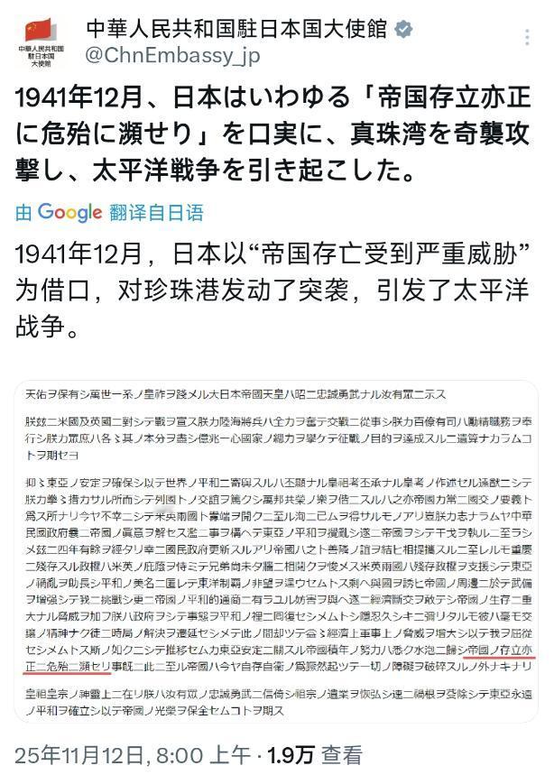 中国驻日大使馆再出来表态了,日本网民直接破防!在11月12日,中国驻日大使馆发文称:1941年12月,日本以所谓的“帝国存亡受到严重威胁”为借口,偷袭美国珍珠港,挑起了太平洋战争。 很多人只知道日本偷袭珍珠港把美国拉进二战,却不清楚这事儿的完整脉络。 当时的日本,在亚洲战场已经陷入泥潭,资源消耗殆尽,却不想收敛侵略野心,反而盯上了东南亚的石油和橡胶。为了扫清扩张路上的最大障碍,日本高层炮制出 “帝国存亡受到严重威胁” 的借口,偷偷制定了偷袭计划。 1941 年 12 月 7 日清晨,日本联合舰队的舰载机突然扑向美国夏威夷珍珠港海军基地,毫无防备的美军遭遇重创,2403 人当场阵亡,8 艘战列舰 4 艘被击沉,188 架飞机在地面被摧毁。 这波不宣而战的偷袭,直接点燃了太平洋战争的导火索,而日本所谓的 “存亡危机”,从头到尾都是为侵略扩张量身定做的谎言。 历史总是惊人地相似。 如今日本自民党大佬高市早苗之流,频频喊出 “台湾有事就是日本有事”“台海局势关乎日本存亡” 的论调,这套话术和当年偷袭珍珠港前的借口,简直是一个模子刻出来的。 中国驻日使馆就是要把这层窗户纸捅破:别以为换个说法就能蒙混过关,你们当年怎么靠编造危机搞侵略,现在还想故技重施,中国人心里门儿清。 更关键的是,现在的中国早不是 80 多年前的样子了。 当年日本能在中国领土上肆意妄为,靠的是双方国力和军事力量的巨大差距。但现在,中国的经济总量稳居世界第二,工业体系完整到覆盖各行各业,从航母到隐形战机,从高超音速武器到信息化作战系统,国防力量早已实现质的飞跃。 国际上,中国的话语权和影响力不断提升,秉持的多边主义理念得到大多数国家认可。 日本想在台海问题上搞小动作,本质上是在挑战一个综合实力全方位碾压自己的国家,这种异想天开的念头,从一开始就注定行不通。 中国驻日使馆的发文,没说一句狠话,却字字戳中要害,直接让日本网友破防了。在日本雅虎、推特等平台上,留言区彻底炸开。一部分网友还是老样子,回避历史,辩称 “珍珠港事件有复杂背景”“中方是在故意挑事”,试图为当年的侵略行为洗白。 但更多网友慌了神,有人吐槽 “高层能不能别乱说话,真把中国惹毛了没好果子吃”,有人担忧 “现在的日本根本没资格和中国叫板,只会把自己拖进深渊”,还有人翻出日本依赖中国市场的事实,质问 “难道想让经济彻底崩盘”。那些曾经叫嚣 “强硬对华” 的声音,在使馆的史实打脸和中国的实力面前,变得有气无力。 其实日本心里很清楚,台湾问题是中国的核心利益,是碰不得的红线。 当年日本靠编造借口发动战争,最终落得战败投降的下场,这个教训本该刻在骨子里。可现在有些政客,好了伤疤忘了疼,总想绑定外部势力,在台海问题上煽风点火,本质上还是没放弃扩张的野心。 中国驻日使馆这波表态,不是要挑起对抗,而是提前亮明底线。历史不会重演,当年日本能靠谎言横行一时,现在却再也没那个条件。中国始终坚持和平发展,但捍卫国家核心利益的决心和能力,不容任何国家质疑。 日本如果执意要走回头路,无视历史教训,无视中国的实力和立场,最终只会重蹈覆辙。 这世上最愚蠢的事,就是低估一个国家捍卫主权的决心,尤其是当这个国家已经足够强大。日本该做的,不是编造危机搞挑衅,而是老老实实正视历史,恪守一个中国原则,不然迟早要为自己的错误买单。