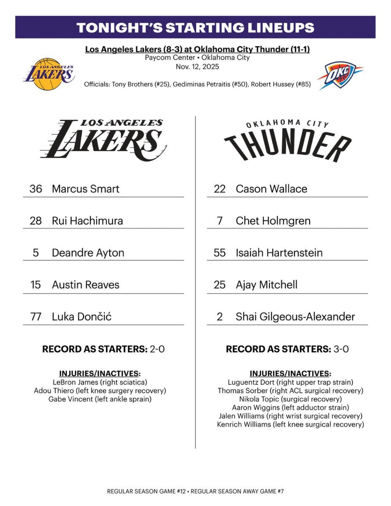湖人五连客第三场打雷霆首发公布:湖人—东契奇,斯玛特、里夫斯,八村垒,艾顿雷霆—亚历山大,米切尔,华莱士,切特,哈腾