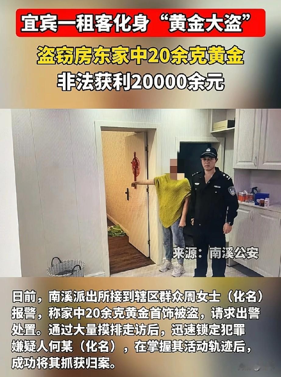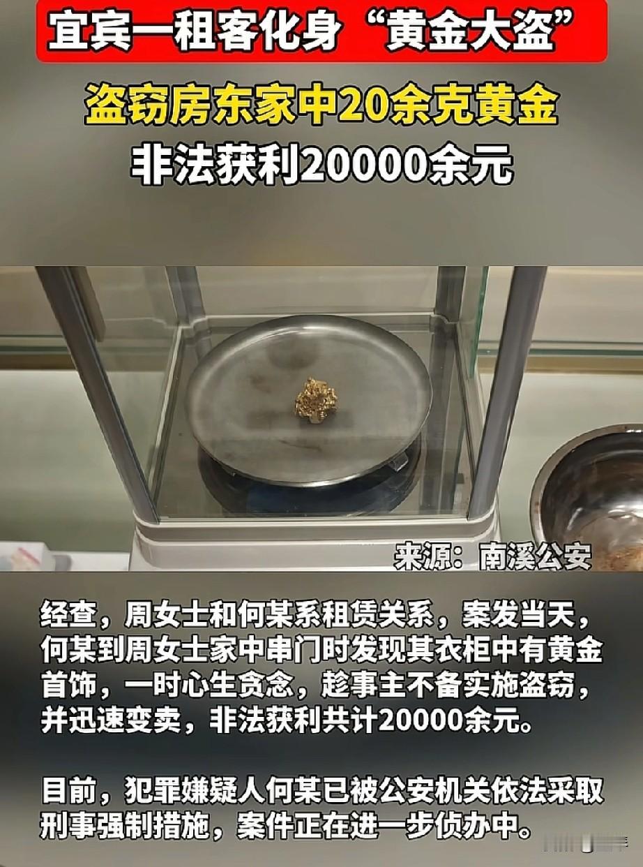 宜宾南溪这位女租客,你有点不地道了啊,住人家里偷人家20克黄金卖2万块钱,你这这操作是真“刑”啊! 咱宜宾最近出了个离谱事儿,租客何某居然把房东家20多克黄金偷了,转手卖了2万多块——这哪是租房啊,分明是奔着“偷家”来的! 房东周女士发现黄金没了赶紧报警,南溪警察效率是真高,摸排查访没费啥功夫就把人揪出来了。现在人已经被抓,这2万块的“横财”,怕是要换好几年牢饭吃。 说真的,租房本来是互相信任的事儿,这租客是把别人的信任当“偷东西的便利”啊!也给咱提个醒:不管是房东还是租客,贵重物品都得锁好,害人之心不可有,防人之心也不能无。 这小偷也是糊涂,20克黄金就眼红了,这样要不得啊! 网眼看宜宾