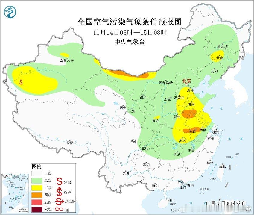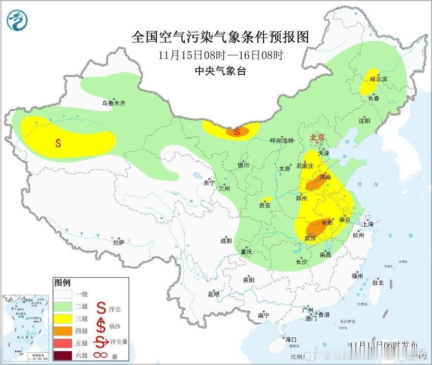 【雾和霾】今晨在河北、湖北、湖南、重庆、四川、贵州、云南部分地区出现大雾。8时部分站点能见度不足100米,比如湖北竹山、湖南南岳、四川大竹、蓬安、蓬溪、射洪、三台、峨眉山、重庆酉阳、云南孟连。另外今晨在河北河南山东安徽江苏部分地区,空气质量存在轻度-中度污染。今天污染随着北风可能略有南下。明天和后天,污染继续在华北南部到黄淮江淮一带堆积。等16-17日冷空气南下后,这一带大气扩散条件会转好。