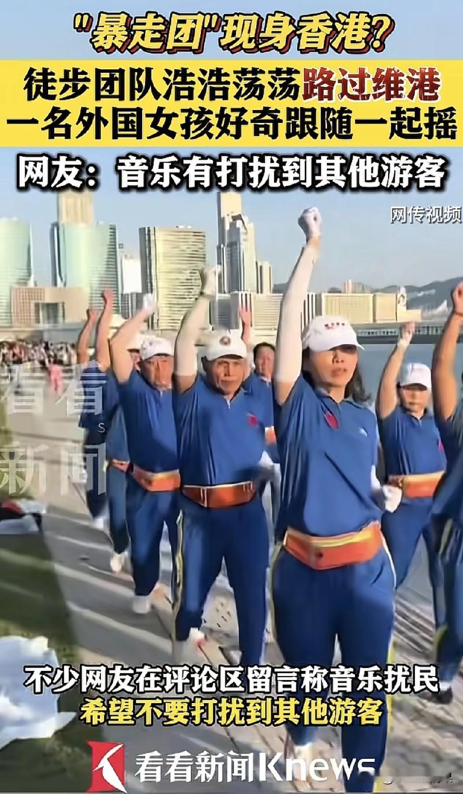 暴走团在不久的将来,估计要发展到海外了,之前在内地霸占机动车道,霸占人行横道,犹如过街老鼠、人人喊打,一点都不受欢迎。 现在好了,内地混不下去了,又跑到香港去了。他(她)们穿着整齐统一样式的衣服,走着一致的步伐,喊着口号在维多利亚港大步走着。 吸引了很多游客观望,可能其它游客们觉得很新鲜,特别是海外游客用了惊讶的眼神在看着他(她)们。