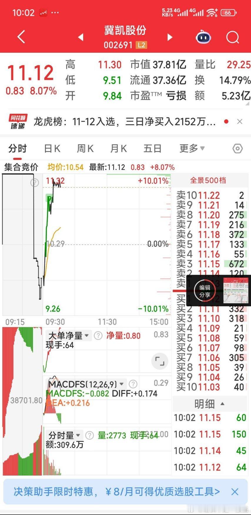 【今日操作思路流程一览】一,现跟踪票有:标准股份,万润科技,龙洲股份,佛塑科技,冀凯股份。1,标准股份,今天上干加仓做了一把T+02,今天狙击了昨天没上车的人民同泰,狙击了龙洲股份。3,择机出局:拓日新能,英唐智控,秦安股份,今天走式偏弱,主力不作为,今天宜择机出局。4,撤单一牛,再入二牛:人民同泰不给上车机会,故撤单。资金追涨介入主力资金正在扫货的佛塑科技,冀凯股份。