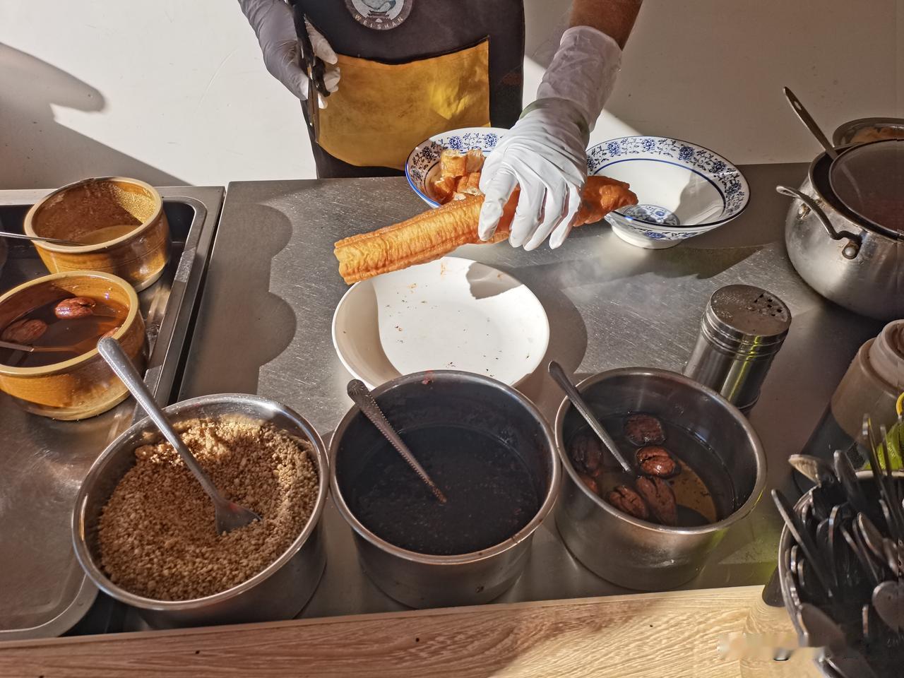 配上现烤的油条或粑粑,撕一块泡进去,吸满豆粉的软嫩带着谷物的清香,咸淡刚好还不腻