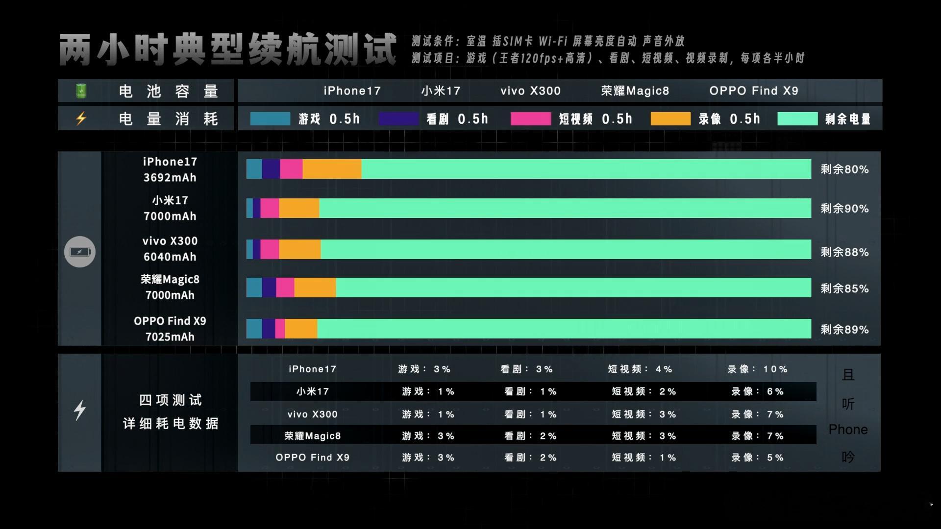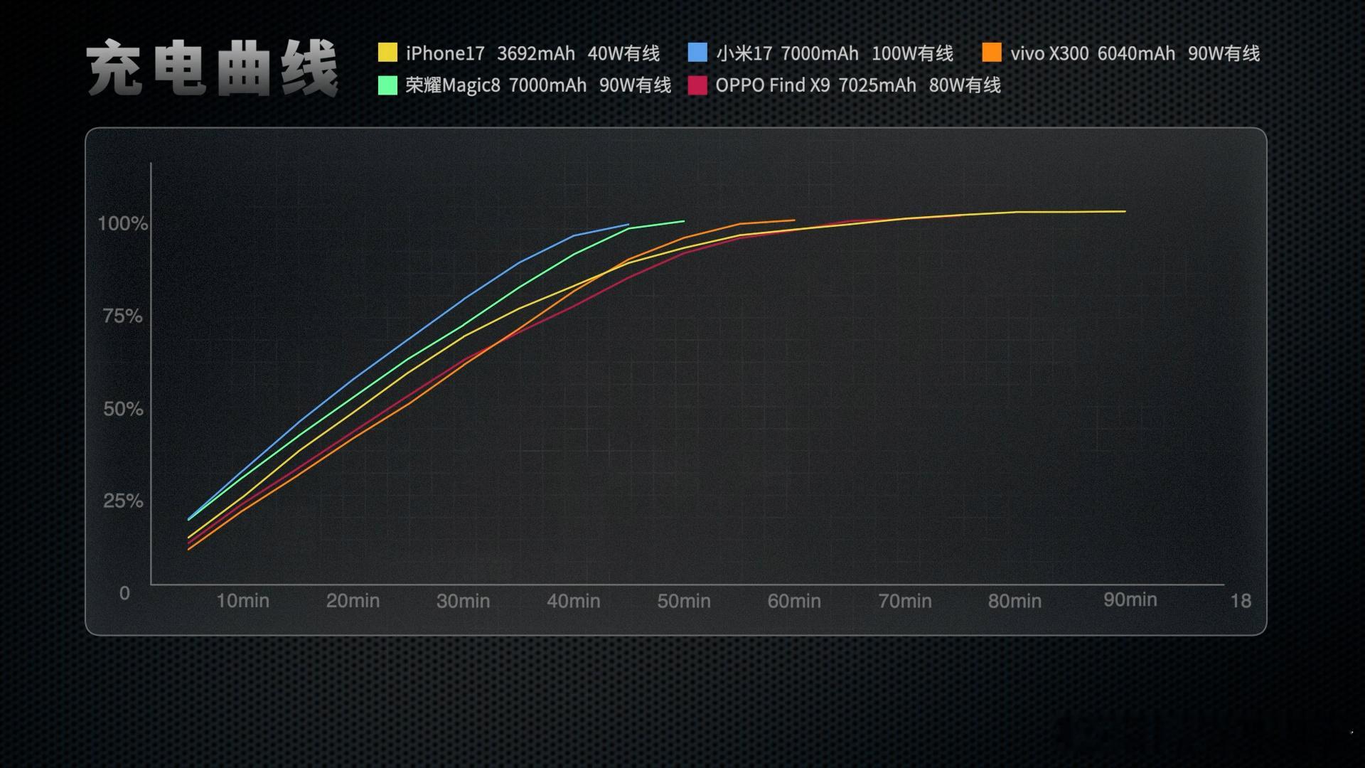 果米OV耀,五款标准版两小时续航成绩如下(图2) iPhone17:3692mAh,剩余80%米17:7000mAh,剩余90%OPPO Find X9:7025mAh,剩余89%vivo X300:6040mAh,剩余88%荣耀Magic8:7000mAh,剩余85%O米耀都是7000mAh,特别是小米,6.3英寸小屏也有大电池,成绩也都在90%附近,正常用一天没问题。vivo同样是6.31英寸小屏,电池虽然稍小,但成绩不拉跨。至于iPhone17,电池容量依然坚持在3000多徘徊,续航也一如既往的。。。快充(图3),小米100W最高,速度上也优势明显。其次是V耀两台90W的机型,OPPO充到100%的速度还不错,但是最后涓流充了10分钟,耗了不少时间。最后iP17,依然发挥稳定,充满要一个半小时左右。