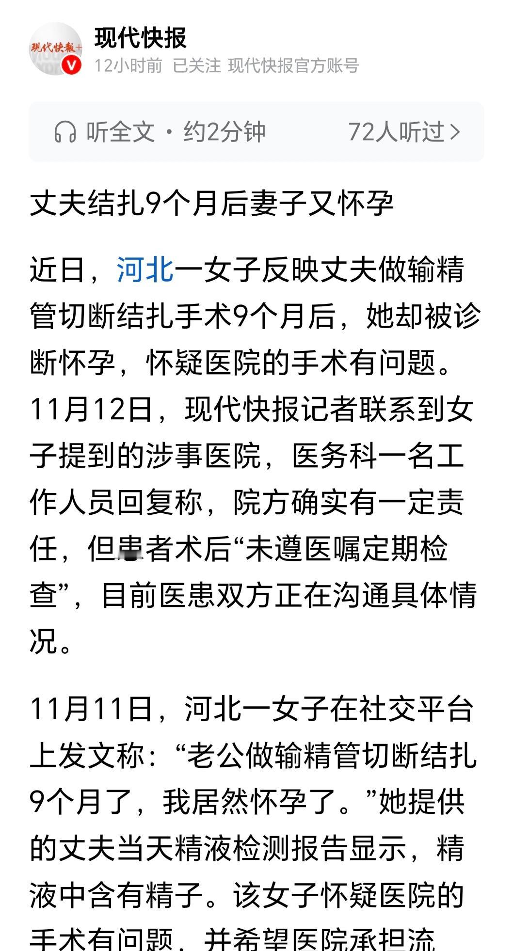 河北一女子爆料,丈夫在保定京济医院做结扎手术后9个月,自己竟意外怀孕,精液检测显示仍有精子,女子要求医院承担相关费用。医院承认有责任,但称患者术后未遵医嘱定期复查,双方就赔偿僵持不下。本文拆解“结扎失败谁担责”“未复查能否减轻医院责任”等核心问题,用通俗法律解读帮大家理清此类医疗纠纷的责任边界,也听听网友们的真实看法。 一、离谱!结扎9个月还怀孕,医院认责却提“未复查” 家人们,做结扎手术本是为了避孕,结果9个月后妻子照样怀孕,换谁都得懵!河北这对夫妻的遭遇,真是让人既无奈又闹心。 今年2月,女子的丈夫到保定京济医院做了输精管切断结扎手术,本以为这下能彻底放心避孕,可没想到11月,女子竟被诊断出怀孕。更关键的是,丈夫后续做的精液检测报告显示,精液里居然还有精子——这明摆着是结扎手术没做好啊!女子又气又急,怀疑医院手术有问题,要求医院承担流产、营养、误工等一系列费用。 11月12日,记者联系到涉事医院,医务科工作人员倒是没否认责任:“既然出了这事儿,医院肯定要解决,我们确实有责任。”可话锋一转,就把矛头指向了患者:“术后大夫特意交代,隔一个月查一次精液常规,连续查三次确认没精子才算成功,但他没按要求来复查,也没提供其他医院的复查报告。”言外之意,患者没遵医嘱,也得担一部分责。 目前双方就赔偿问题谈了好几次,都没达成一致,女子之前发的爆料帖也已经删除,这事到底咋解决,还得看后续协商。但网友们的讨论早就炸开了锅——结扎手术失败,到底是医院技术不行,还是患者没复查的锅? 二、划重点!结扎失败谁担责?法律边界讲透了 很多人都有疑问:做了结扎手术还怀孕,医院必须赔吗?患者没复查,责任就该自己扛吗?今天用大白话把法律逻辑掰明白,以后遇到类似医疗纠纷,别再吃哑巴亏! 1. 医院先担“过错责任”,手术失败≠完全免责 结扎手术属于医疗服务,医院有义务保证手术效果符合诊疗规范。根据《民法典》,医疗机构在诊疗活动中未尽到合理诊疗义务,造成患者损害的,就得承担赔偿责任。女子丈夫术后9个月仍有精子、妻子怀孕,说明手术没达到“避孕”的核心目的,医院首先要证明自己手术操作没问题(比如提供手术记录、医生资质等),拿不出证据,就默认有过错,得承担相应责任(比如流产费、误工费等)。 2. 患者“未复查”,会减轻医院责任但不会免责 医院说患者没遵医嘱复查,这确实会影响责任划分,但不是“一推了之”。复查的目的是及时发现手术是否成功,患者没按时复查,属于“自身存在一定过错”,可能会减轻医院的赔偿比例(比如原本医院赔100%,现在赔70%-80%),但绝不能让医院完全免责——毕竟手术失败的核心原因,还是医院的诊疗行为是否达标,不能把“没复查”当挡箭牌。 3. 这些证据一定要留好! 遇到医疗纠纷,别慌着吵架,先固定好3类证据:① 手术病历、缴费凭证、术后注意事项卡片;② 精液检测报告、怀孕诊断证明;③ 与医院沟通的录音、聊天记录。有了这些,后续协商或起诉都有依据,维权才更顺利。 三、网友吵翻!医院甩锅还是患者大意?观点太真实 这事儿一曝光,评论区直接分成两派,吵得不可开交,两种观点都戳中人心: 吐槽医院甩锅、支持女子维权的网友占多数: “结扎是绝育手术,做了还怀孕,不是医院技术差是什么?还好意思怪患者没复查?” “术后复查是为了确认效果,不是给医院留‘甩锅通道’,难道没复查,手术失败就不用管了?” “我表哥之前也做过结扎,医院全程跟踪复查,还主动打电话提醒,这医院明显没尽到责任!” “女子要流产、误工,遭罪又花钱,医院必须全额赔偿,别找借口!” 也有网友觉得“双方都有责任”: “医院手术没做好是事实,但患者也该遵医嘱复查,早复查早发现问题,不至于怀孕后更麻烦。” “复查三次又不麻烦,都是为了自己的权益,患者没重视,也得承担点责任。” “医疗不是100%完美,但医院得拿出诚意解决,别光靠‘未复查’减轻责任。” 还有网友分享经历:“我朋友之前结扎后没复查,半年后妻子怀孕,最后医院赔了80%的费用,因为医院拿不出手术合格的证据,患者没复查只减了20%责任。”可见,医院想靠“未复查”完全免责,根本站不住脚。 结论:结扎失败谁该买单?这两个问题值得深思 丈夫结扎9个月妻子仍怀孕,这事看似是“小概率意外”,实则暴露了医疗服务中的责任划分痛点——医院不能把“术后复查”当免责金牌,患者也不能忽视复查的重要性,可核心矛盾还是“手术失败的主要责任该归谁”? 医疗服务既要讲技术,更要讲责任。希望这起事件能推动医院规范诊疗流程,也提醒大家:做医疗手术别忽视术后注意事项,遇到纠纷别冲动,留好证据依法维权。你对这事儿有啥看法?欢迎在评论区留言讨论!