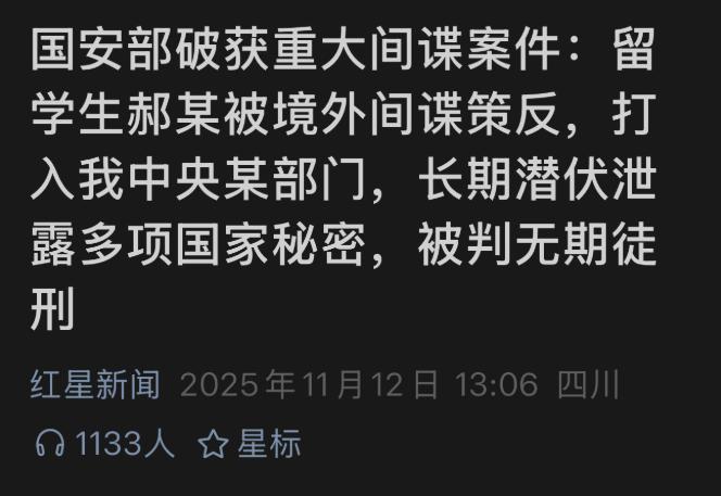 11 月 12 日,国家安全部详细披露一起重大间谍案:海归人员郝某在日本留学期间被美国中央情报局策反,回国后潜伏进入某国家机要部门,长期窃取、泄露机密级国家秘密 5 项、秘密级国家秘密 2 项,以及 14 项符合《刑法》第一百一十一条规定的情报,最终被依法判处无期徒刑。 这起并非虚构的案件,堪称境外间谍情报机关渗透策反的 “典型样本”,给所有人敲响了国家安全的警钟 —— 保卫国家安全从不是口号,而是必须守住的现实底线。 郝某曾是众人眼中 “走出去的希望”,但 “出国留学” 从未自动等同于 “爱国” 标签:绝大多数留学生归国后致力于报效祖国,却有极少数人如郝某一般,沦为境外势力的棋子。 根据官方披露的完整流程,郝某的策反过程有着清晰的套路:留学期间因办理赴美签证结识美驻日本使馆官员泰德,对方以请客吃饭、赠送礼品、支付论文 “稿费” 等方式逐步拉近关系,随后介绍同事李军与郝某对接。 在郝某留学期满前,李军亮明美国中央情报局东京站人员身份,对其正式策反,郝某不仅签署了参谍协议,还接受了美方的专门考核和培训。归国后,郝某并非偶然入职机要单位,而是在境外间谍情报机关的精心策划下,精准 “应聘” 潜伏,期间多次与中情局人员秘密接头、收取间谍经费,持续开展窃密活动。 最值得警惕的是郝某的 “潜伏特质”:他在单位里与普通职员别无二致,日常打卡、参与工作交流,表面毫无异常,背地里却持续从事危害国家安全的勾当。 这种 “隐蔽性” 正是此类间谍的可怕之处 —— 他们不靠暴力破坏,而是依托内部身份长期渗透,其行为往往在被查处前难以察觉,对国家安全造成的危害更为深远。 国家安全部对郝某的打击并非偶然突袭,而是经过长期侦查、掌握确凿证据后的精准执法。无期徒刑的判决,绝非象征性惩戒,而是国家法律对 “出卖国家利益” 行为的严厉追责,彰显了我国捍卫国家安全的坚定决心。 此案也让不少人联想到董明珠曾 “不用海归” 的争议言论,虽二者无必然逻辑关联 —— 企业用人选择与危害国家安全的犯罪案件本质不同,但也从侧面印证了一个核心问题:人才甄别不能只看学历、简历等外在标签,更要重视其忠诚底色、价值观取向和实际行为记录。 必须明确的是,不能因郝某一案就否定整个海归群体,绝大多数留学生始终心系祖国、踏实奋进,但这起案件确实提醒我们,人员甄别和背景审查必须严之又严,不能有丝毫松懈。 国家安全是不可触碰的底线,容不得任何侥幸。从网络信息保密到人员背景核查,从单位内部管理到个人风险防范,每一个环节都至关重要。这不是 “多疑”,而是现实的必然要求 —— 郝某案绝非个例,境外间谍情报机关对我国的渗透策反从未停止,可能还有未被曝光的 “潜伏者”,这需要全社会保持高度警惕。 这起案件更给所有单位敲响警钟:新时代的用人导向,不能只重效率而忽视忠诚。 国家安全从来不是军队、公安等特定部门的 “独角戏”,而是每个组织、每个公民的共同责任。郝某的教训无比沉重:他曾拥有的 “高起点”“海归光环”,在国家安全面前一文不值;他自以为在为 “更大利益” 服务,实则只是境外势力的工具,最终落得身陷囹圄、一生尽毁的下场。 这不是戏剧化的悲剧,而是对所有公民的现实警示:任何试图触碰国家安全红线的行为,都将受到法律的严惩;捍卫国家利益,是每个中国人的责任与义务,容不得半点动摇。