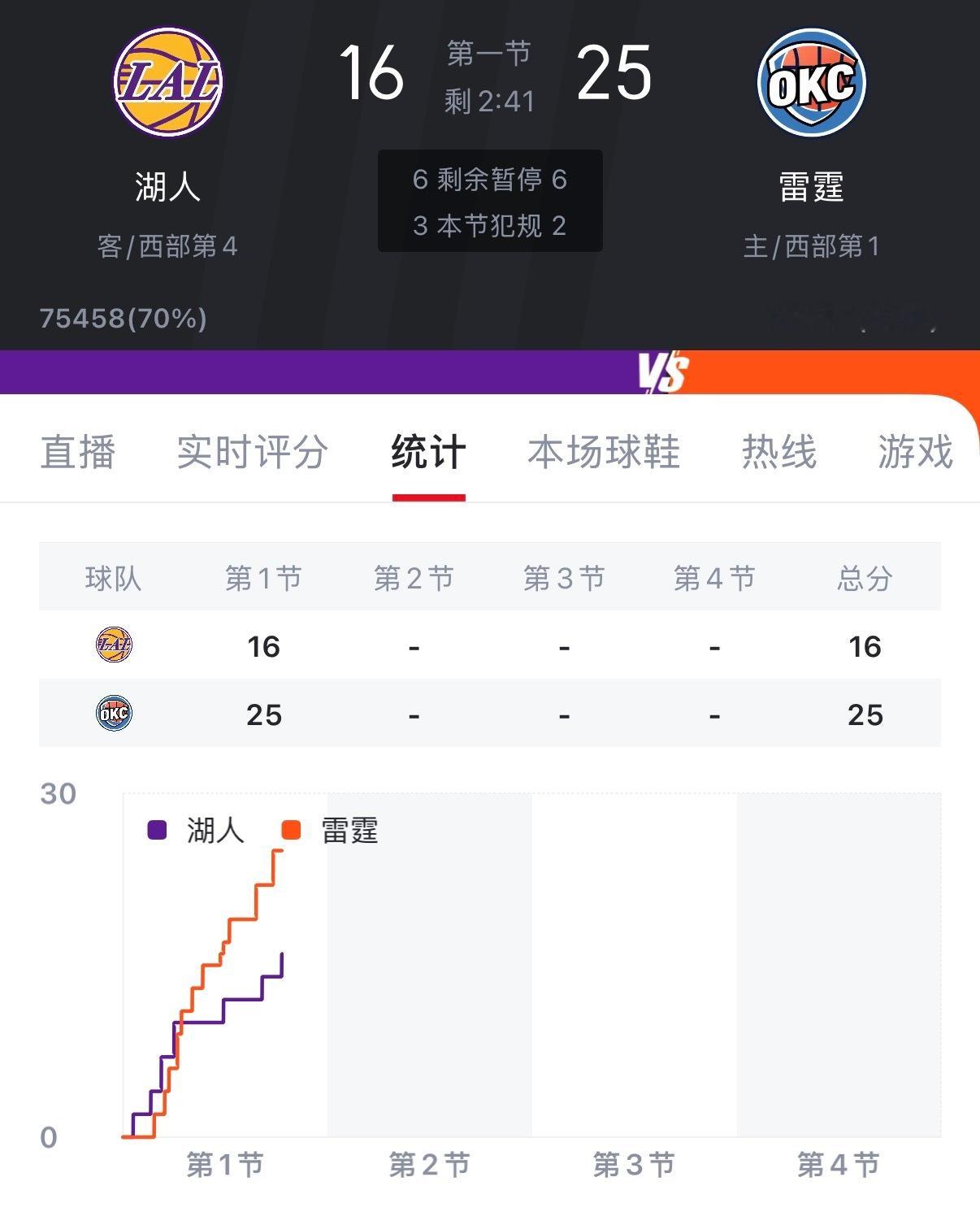 暂停!湖人16:25落后雷霆9分! 雷霆的防守真好,第一节咱们被上课了。卡鲁索真是我的心头痛