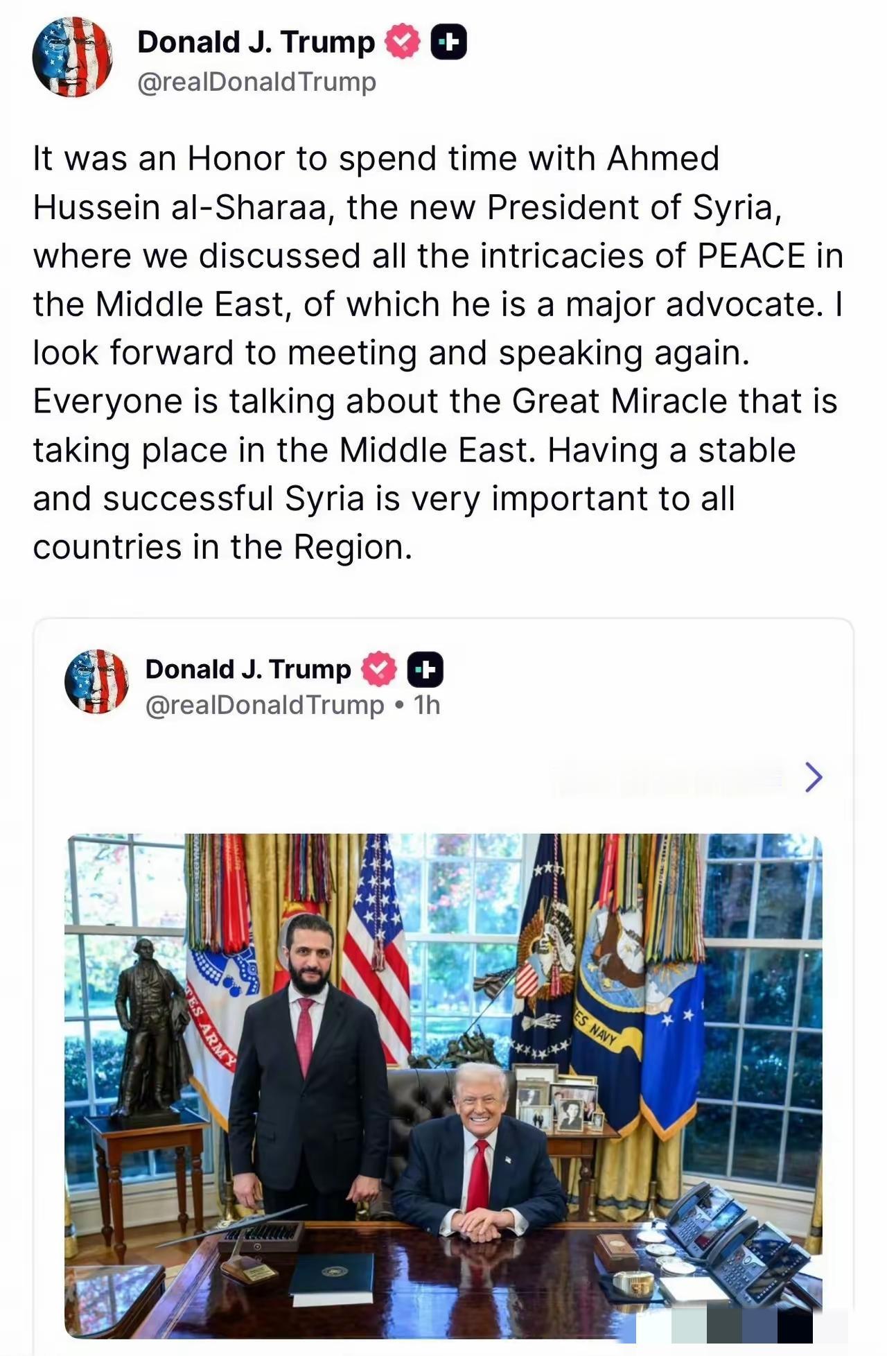 这照片足以使泽连斯基欲哭无泪,悔之莫及。 特朗普高调晒出他在白宫与昔日的恐怖组织大哥大朱尼拉的合影。不难看出,朱尼拉在白宫的待遇大大超过了乌克兰总统泽连斯基。 泽连斯基在白宫屡屡陪小心得到却是奚落和冷遇,他不惜拿出子孙饭碗中的矿产资源与美方交换,也没有换来“战斧”远程导弹。 临了,泽连斯基得到的一句话是“美国不再无偿援助乌克兰!” 与此形成鲜明对照是几年前还是美国花大价钱要卖其人头的朱尼拉,竟然得到了特朗普的赏识,在白宫礼遇有加! 这氛围足以证明两人惺惺相惜,相谈甚欢。 真不知道泽连斯基总统看到后会有何感想。