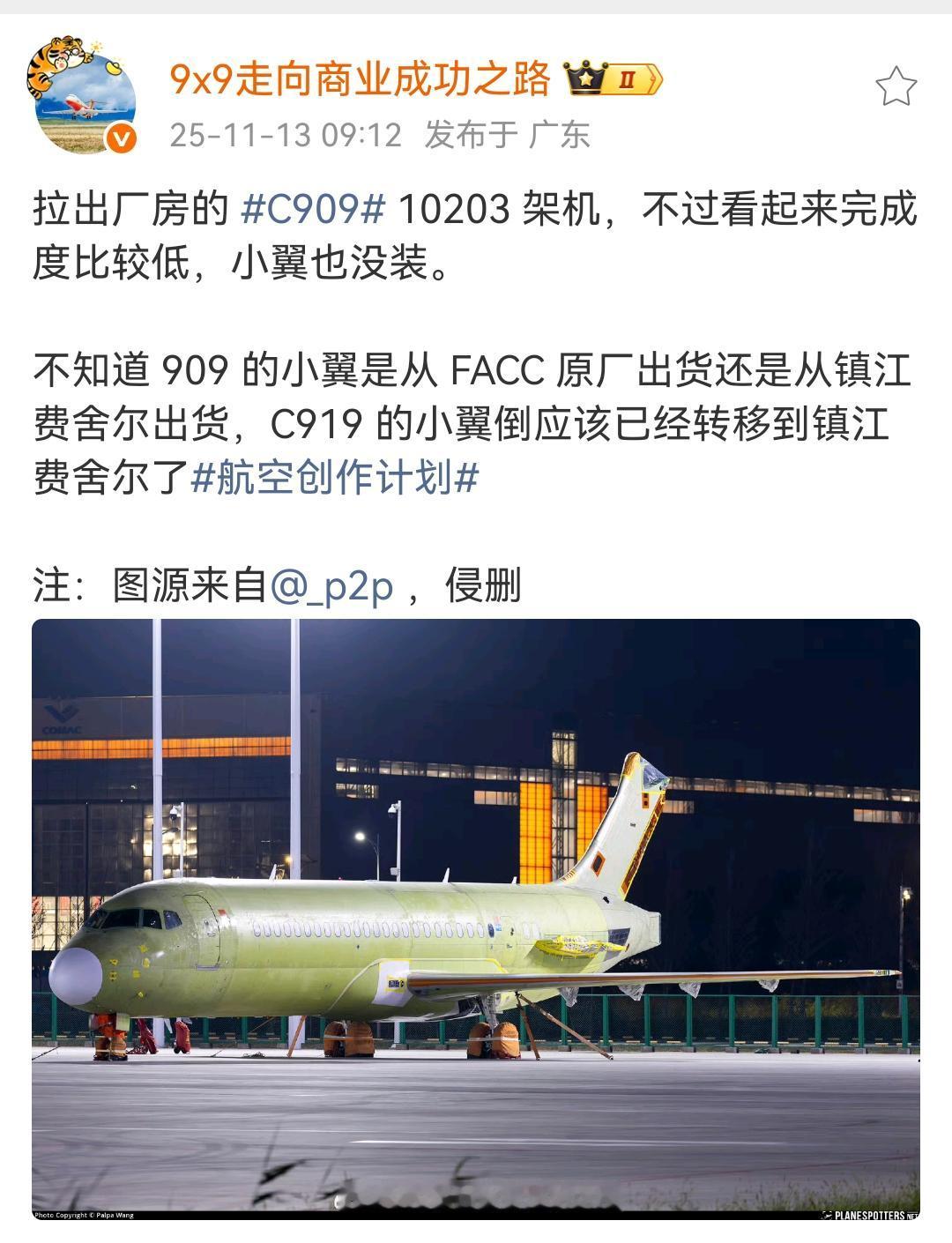 拉出厂房的C909第10203 架机,不过看起来完成度比较低,小翼也没装。 这样拉出厂房,说明厂房内没有地方可以停这个飞机,还是要努力扩建厂房呀,这个放在室外还需要做一次保护增加了工时。 都说C909会有新构型,但是从目前来看也看不出来有什么改变,毕竟这种升级在外观层面是微乎其微的。 各位是怎么看的?欢迎评论区留言。